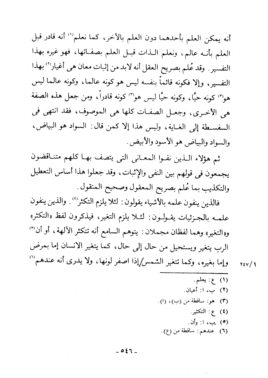 فَالَّذِينَ يَنْفُونَ عِلْمَهُ بِالْأَشْيَاءِ يَقُولُونَ: لِئَلَّا يَلْزَمَ التَّكَثُّرُ (¬5) . وَالَّذِينَ يَنْفُونَ عِلْمَهُ بِالْجُزَئِيَّاتِ يَقُولُونَ: لِئَلَّا يَلْزَمَ التَّغَيُّرُ، فَيَذْكُرُونَ لَفْظَ " التَّكَثُّرِ " وَ " التَّغَيُّرِ " وَهُمَا لَفْظَانِ مُجْمَلَانِ: يَتَوَهَّمُ السَّامِعُ أَنَّهُ تَتَكَثَّرُ الْآلِهَةُ، أَوْ أَنَّ (¬6) الرَّبَّ يَتَغَيَّرُ وَيَسْتَحِيلُ مِنْ حَالٍ إِلَى حَالٍ، كَمَا يَتَغَيَّرُ الْإِنْسَانُ إِمَّا بِمَرَضٍ وَإِمَّا بِغَيْرِهِ، وَكَمَا تَتَغَيَّرُ الشَّمْسُ إِذَا اصْفَرَّ لَوْنُهَا، وَلَا يَدْرِي أَنَّهُ عِنْدَهُمْ (¬7)