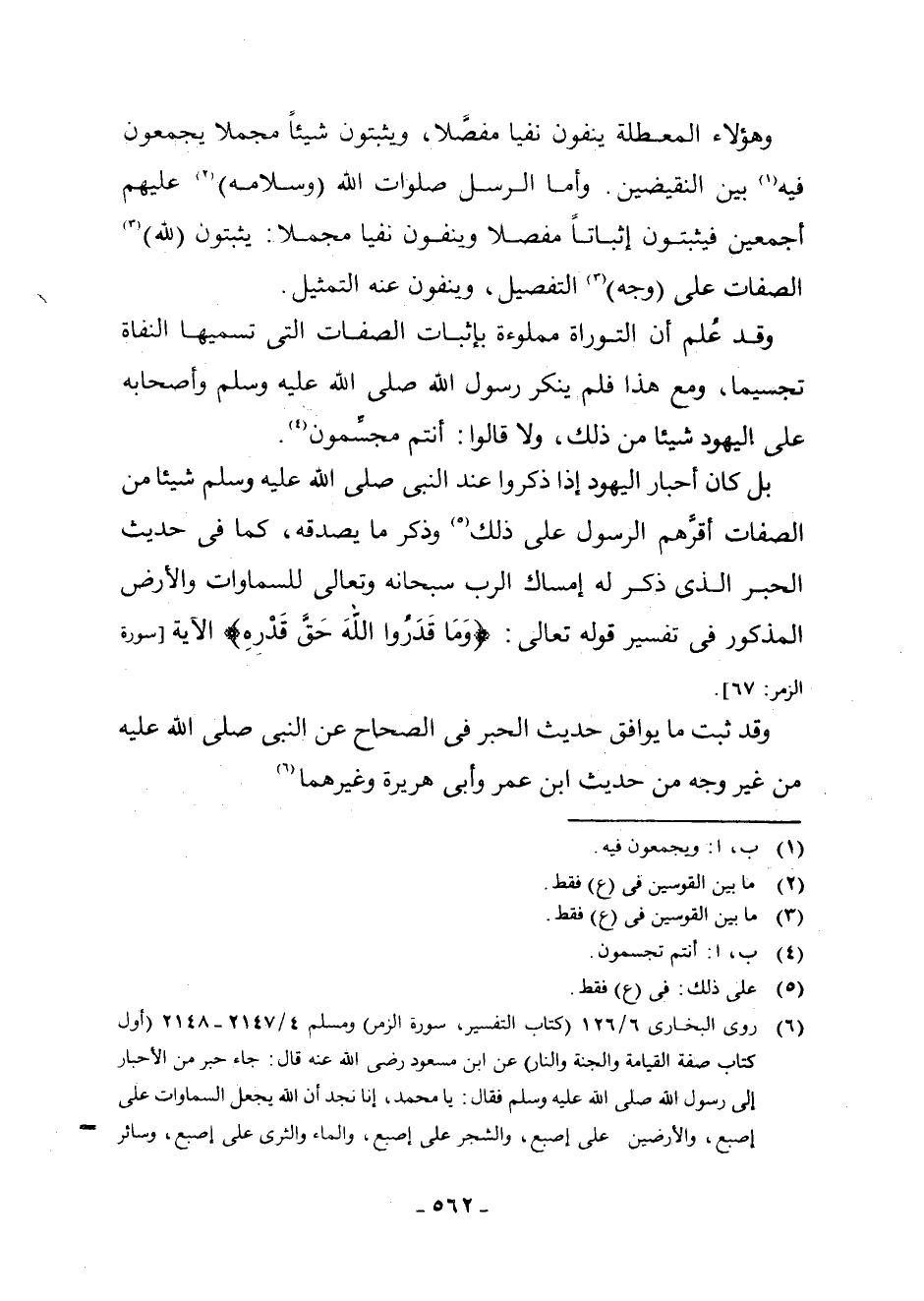 وَقَدْ عُلِمَ أَنَّ التَّوْرَاةَ مَمْلُوءَةٌ بِإِثْبَاتِ الصِّفَاتِ الَّتِي تُسَمِّيهَا النُّفَاةُ تَجْسِيمًا، وَمَعَ هَذَا فَلَمْ يُنْكِرْ رَسُولُ اللَّهِ - صَلَّى اللَّهُ عَلَيْهِ وَسَلَّمَ - وَأَصْحَابُهُ عَلَى الْيَهُودِ شَيْئًا مِنْ ذَلِكَ، وَلَا قَالُوا: أَنْتُمْ مُجَسِّمُونَ. (¬5) بَلْ كَانَ أَحْبَارُ الْيَهُودِ إِذَا ذَكَرُوا عِنْدَ النَّبِيِّ - صَلَّى اللَّهُ عَلَيْهِ وَسَلَّمَ - شَيْئًا مِنَ الصِّفَاتِ أَقَرَّهُمُ الرَّسُولُ عَلَى ذَلِكَ (¬6) وَذَكَرَ مَا يُصَدِّقُهُ، كَمَا فِي حَدِيثِ الْحَبْرِ الَّذِي ذَكَرَ لَهُ إِمْسَاكَ الرَّبِّ سُبْحَانَهُ وَتَعَالَى لِلسَّمَاوَاتِ وَالْأَرْضِ الْمَذْكُورَ فِي تَفْسِيرِ قَوْلِهِ تَعَالَى: {وَمَا قَدَرُوا اللَّهَ حَقَّ قَدْرِهِ} الْآيَةَ [سُورَةُ الزُّمَرِ: 67] .