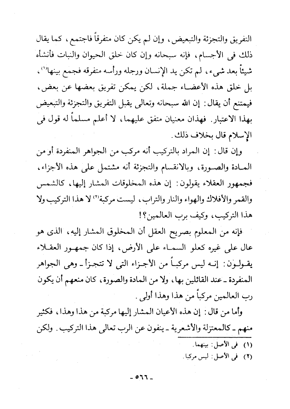 وَإِنْ قَالَ: إِنَّ الْمُرَادَ بِالتَّرْكِيبِ أَنَّهُ مُرَكَّبٌ مِنَ الْجَوَاهِرِ الْمُنْفَرِدَةِ أَوْ مِنَ الْمَادَّةِ وَالصُّورَةِ، وَبِالِانْقِسَامِ وَالتَّجْزِئَةِ أَنَّهُ مُشْتَمِلٌ عَلَى هَذِهِ الْأَجْزَاءِ، فَجُمْهُورُ الْعُقَلَاءِ يَقُولُونَ: إِنَّ هَذِهِ الْمَخْلُوقَاتِ الْمُشَارَ إِلَيْهَا، كَالشَّمْسِ وَالْقَمَرِ وَالْأَفْلَاكِ وَالْهَوَاءِ وَالنَّارِ وَالتُّرَابِ، لَيْسَتْ مُرَكَّبَةً (¬2) لَا هَذَا التَّرْكِيبَ وَلَا هَذَا التَّرْكِيبَ، وَكَيْفَ بِرَبِّ الْعَالَمِينَ؟ !