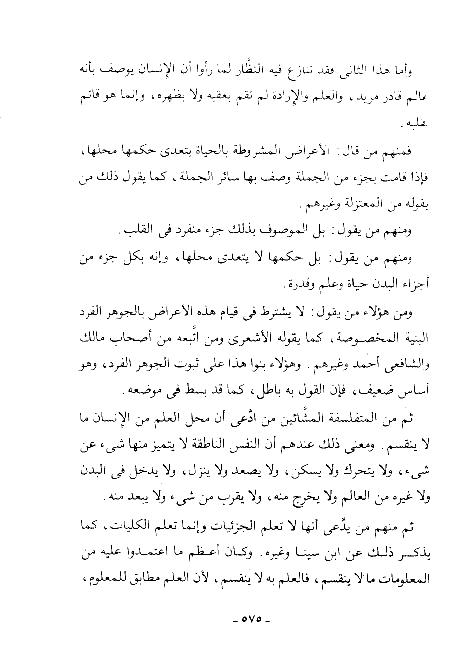 وَأَمَّا هَذَا الثَّانِي فَقَدْ تَنَازَعَ فِيهِ النُّظَّارُ لَمَّا رَأَوْا أَنَّ الْإِنْسَانَ يُوصَفُ بِأَنَّهُ عَالِمٌ قَادِرٌ مُرِيدٌ، وَالْعِلْمُ وَالْإِرَادَةُ لَمْ تَقُمْ بِعَقِبِهِ وَلَا بِظَهْرِهِ، وَإِنَّمَا هُوَ قَائِمٌ بِقَلْبِهِ.
