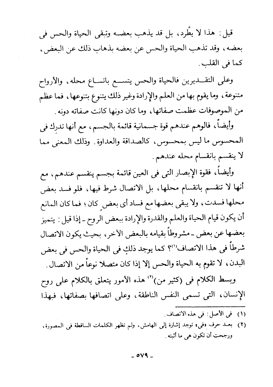 وَأَيْضًا، فَقُوَّةُ الْإِبْصَارِ الَّتِي فِي الْعَيْنِ قَائِمَةٌ بِجِسْمٍ يَنْقَسِمُ عِنْدَهُمْ، مَعَ أَنَّهَا لَا تَنْقَسِمُ بِانْقِسَامِ مَحَلِّهَا، بَلِ الِاتِّصَالُ شَرْطٌ فِيهَا، فَلَوْ فَسَدَ بَعْضُ مَحَلِّهَا فَسَدَتْ، وَلَا يَبْقَى بَعْضُهَا مَعَ فَسَادِ أَيِّ بَعْضٍ كَانَ، فَمَا كَانَ الْمَانِعُ أَنْ يَكُونَ قِيَامُ الْحَيَاةِ وَالْعِلْمِ وَالْقُدْرَةِ وَالْإِرَادَةِ بِبَعْضِ الرُّوحِ - إِذَا قِيلَ: يَتَمَيَّزُ بَعْضُهَا عَنْ بَعْضٍ - مَشْرُوطًا بِقِيَامِهِ بِالْبَعْضِ الْآخَرِ، بِحَيْثُ يَكُونُ الِاتِّصَالُ شَرْطًا فِي هَذَا الِاتِّصَافِ؟ (¬1) كَمَا يُوجَدُ ذَلِكَ فِي الْحَيَاةِ وَالْحِسِّ فِي بَعْضِ الْبَدَنِ، لَا تَقُومُ بِهِ الْحَيَاةُ وَالْحِسُّ إِلَّا إِذَا كَانَ مُتَّصِلًا نَوْعًا مِنَ الِاتِّصَالِ.