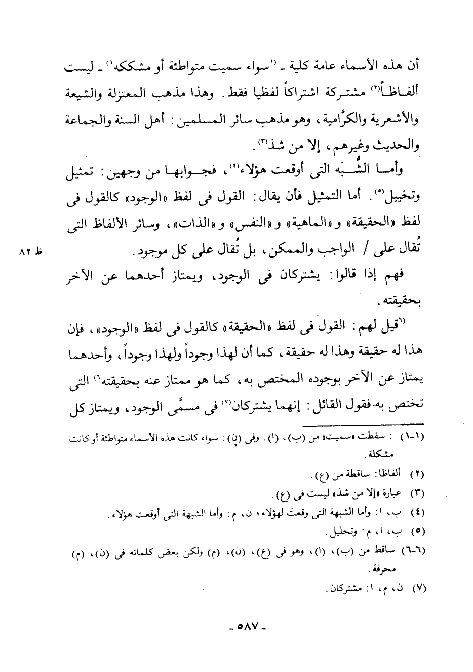 أَنَّ هَذِهِ الْأَسْمَاءَ عَامَّةٌ كُلِّيَّةٌ - (1 سَوَاءٌ سُمِّيَتْ مُتَوَاطِئَةً أَوْ مُشَكِّكَةً 1) (¬1) - لَيْسَتْ أَلْفَاظًا (¬2) مُشْتَرِكَةً اشْتِرَاكًا لَفْظِيًّا فَقَطْ. وَهَذَا مَذْهَبُ الْمُعْتَزِلَةِ وَالشِّيعَةِ وَالْأَشْعَرِيَّةِ وَالْكَرَّامِيَّةِ، وَهُوَ مَذْهَبُ سَائِرِ الْمُسْلِمِينَ: أَهْلِ السُّنَّةِ وَالْجَمَاعَةِ وَالْحَدِيثِ وَغَيْرِهِمْ، إِلَّا مَنْ شَذَّ (¬3) .