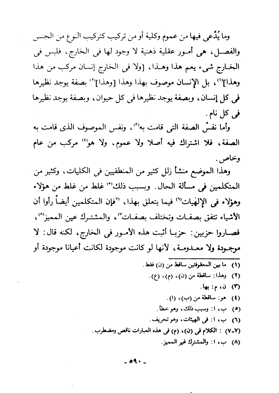 وَهَذَا الْمَوْضِعُ مَنْشَأُ زَلَلِ كَثِيرٍ مِنَ الْمَنْطِقِيِّينَ فِي الْكُلِّيَّاتِ، وَكَثِيرٌ مِنَ الْمُتَكَلِّمِينَ فِي مَسْأَلَةِ الْحَالِ. وَبِسَبَبِ ذَلِكَ (¬5) غَلِطَ مَنْ غَلِطَ مِنْ هَؤُلَاءِ وَهَؤُلَاءِ فِي الْإِلَهِيَّاتِ (¬6) فِيمَا يَتَعَلَّقُ بِهَذَا، (7 فَإِنَّ الْمُتَكَلِّمِينَ أَيْضًا رَأَوْا أَنَّ الْأَشْيَاءَ تَتَّفِقُ بِصِفَاتٍ وَتَخْتَلِفُ بِصِفَاتٍ 7) (¬7) ، وَالْمُشْتَرَكُ عَيْنُ الْمُمَيَّزِ (¬8) ، فَصَارُوا حِزْبَيْنِ: حِزْبًا أَثْبَتَ هَذِهِ الْأُمُورَ فِي الْخَارِجِ، لَكِنَّهُ قَالَ: لَا مَوْجُودَةٌ وَلَا مَعْدُومَةٌ، لِأَنَّهَا لَوْ كَانَتْ مَوْجُودَةً لَكَانَتْ أَعْيَانًا مَوْجُودَةً أَوْ