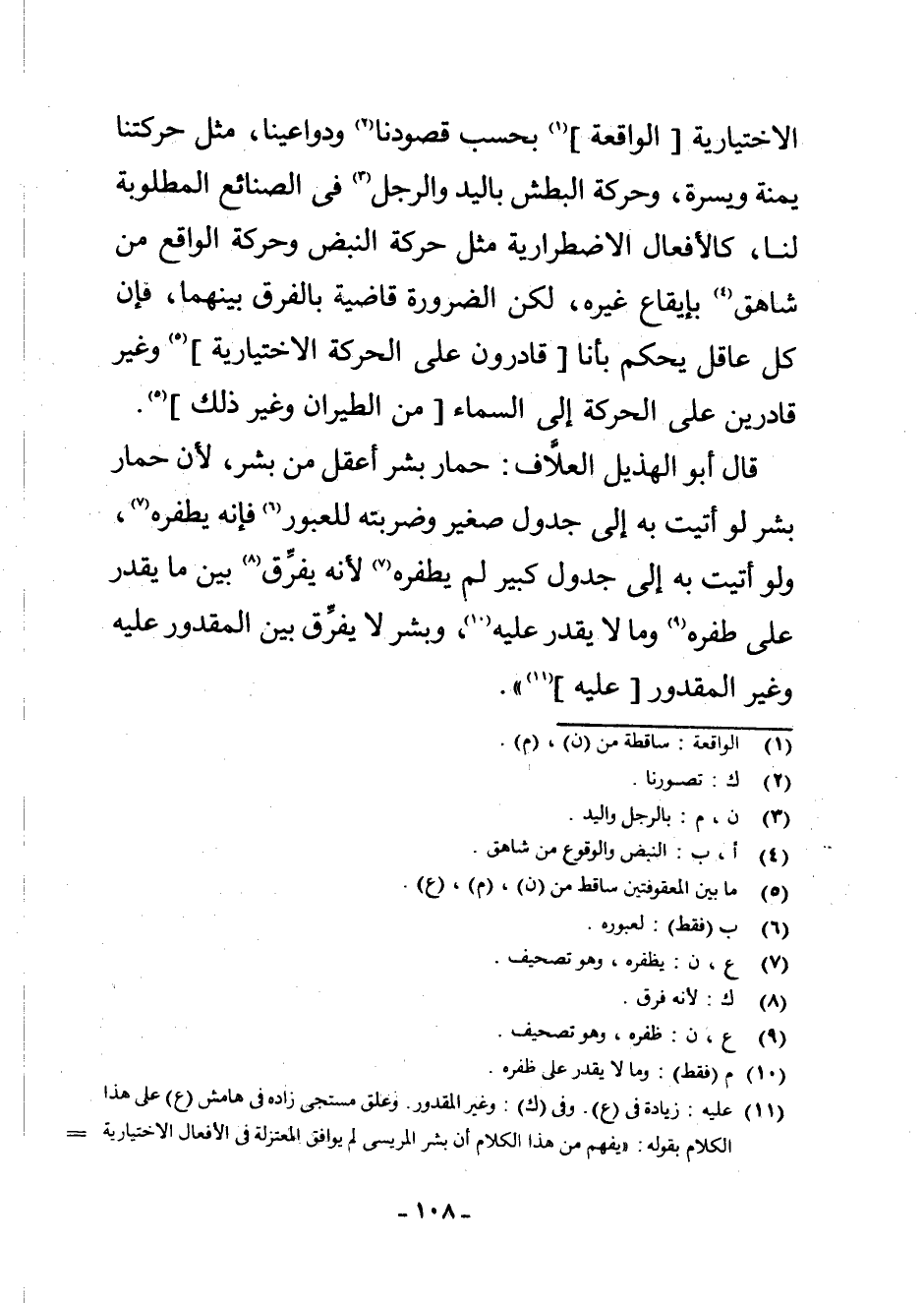 قَالَ أَبُو الْهُذَيْلِ الْعَلَّافُ: حِمَارُ بِشْرٍ أَعْقَلُ مِنْ بِشْرٍ ; لِأَنَّ حِمَارَ بِشْرٍ لَوْ أَتَيْتَ بِهِ إِلَى جَدْوَلٍ صَغِيرٍ وَضَرَبْتَهُ لِلْعُبُورِ (¬7) فَإِنَّهُ يَطْفِرُهُ (¬8) وَلَوْ أَتَيْتَ بِهِ إِلَى جَدْوَلٍ كَبِيرٍ لَمْ يَطْفِرْهُ (¬9) ; لِأَنَّهُ يُفَرِّقُ (¬10) بَيْنَ مَا يَقْدِرُ عَلَى طَفْرِهِ (¬11) وَمَا لَا يَقْدِرُ عَلَيْهِ (¬12) وَبِشْرٌ لَا يُفَرِّقُ بَيْنَ الْمَقْدُورِ عَلَيْهِ وَغَيْرِ الْمَقْدُورِ [عَلَيْهِ] (¬13)