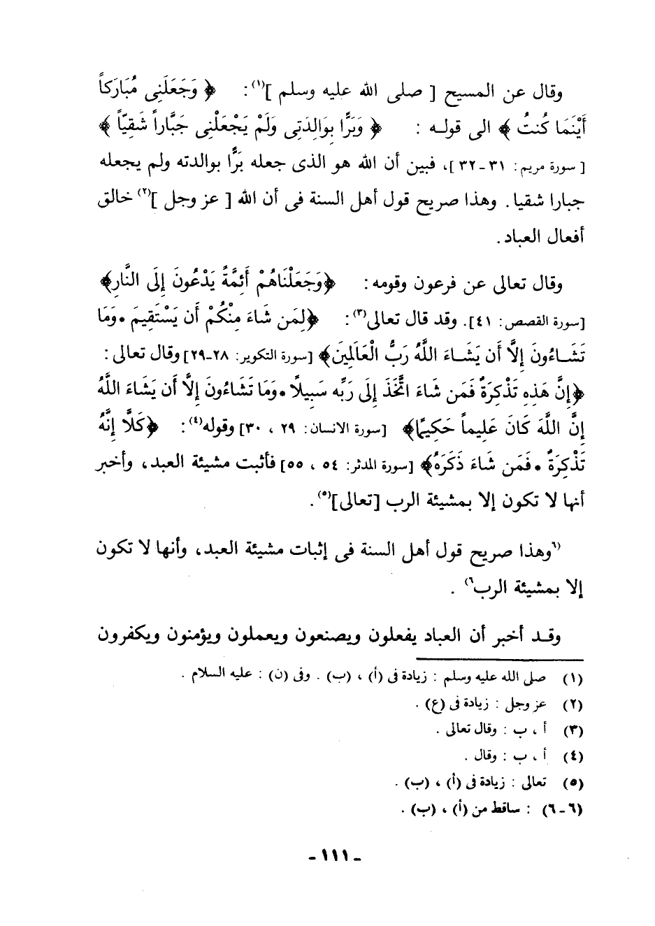 وَقَالَ تَعَالَى عَنْ فِرْعَوْنَ وَقَوْمِهِ: {وَجَعَلْنَاهُمْ أَئِمَّةً يَدْعُونَ إِلَى النَّارِ} [سُورَةُ الْقَصَصِ: 41] . وَقَدْ قَالَ تَعَالَى (¬3) : {لِمَنْ شَاءَ مِنْكُمْ أَنْ يَسْتَقِيمَ - وَمَا تَشَاءُونَ إِلَّا أَنْ يَشَاءَ اللَّهُ رَبُّ الْعَالَمِينَ} [سُورَةُ التَّكْوِيرِ: 28، 29] ، وَقَالَ تَعَالَى: {إِنَّ هَذِهِ تَذْكِرَةٌ فَمَنْ شَاءَ اتَّخَذَ إِلَى رَبِّهِ سَبِيلًا - وَمَا تَشَاءُونَ إِلَّا أَنْ يَشَاءَ اللَّهُ إِنَّ اللَّهَ كَانَ عَلِيمًا حَكِيمًا} [سُورَةُ الْإِنْسَانِ: 29، 30] ، وَقَوْلُهُ (¬4) : {كَلَّا إِنَّهُ تَذْكِرَةٌ - فَمَنْ شَاءَ ذَكَرَهُ} [سُورَةُ الْمُدَّثِّرِ: 54، 55] فَأَثْبَتَ مَشِيئَةَ الْعَبْدِ، وَأَخْبَرَ أَنَّهَا لَا تَكُونُ إِلَّا بِمَشِيئَةِ الرَّبِّ [تَعَالَى] (¬5) . (¬6) . وَهَذَا صَرِيحُ قَوْلِ أَهْلِ السُّنَّةِ فِي إِثْبَاتِ مَشِيئَةِ الْعَبْدِ، وَأَنَّهَا لَا تَكُونُ إِلَّا بِمَشِيئَةِ الرَّبِّ (¬7) .