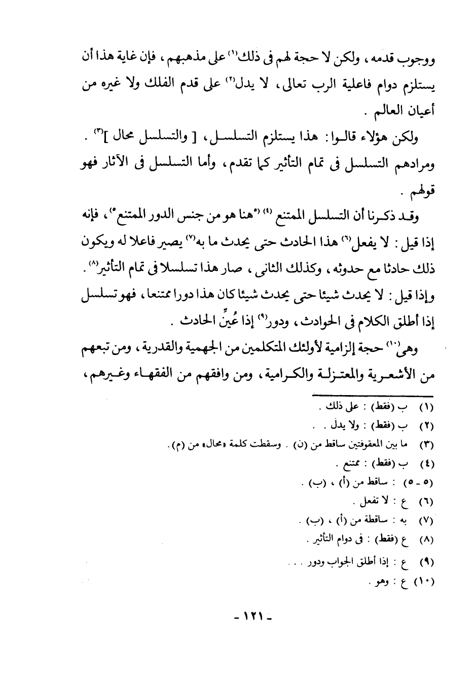 وَقَدْ ذَكَرْنَا أَنَّ التَّسَلْسُلَ الْمُمْتَنِعَ (¬4) هُنَا هُوَ مِنْ جِنْسِ الدَّوْرِ الْمُمْتَنِعِ (¬5) ، فَإِنَّهُ إِذَا قِيلَ: لَا يَفْعَلُ (¬6) هَذَا الْحَادِثَ حَتَّى يَحْدُثَ مَا بِهِ بِهِ: (¬7) يَصِيرُ فَاعِلًا لَهُ وَيَكُونُ ذَلِكَ حَادِثًا مَعَ حُدُوثِهِ، وَكَذَلِكَ الثَّانِيَ، صَارَ هَذَا تَسَلْسُلًا فِي تَمَامِ التَّأْثِيرِ (¬8) وَإِذَا قِيلَ: لَا يُحْدِثُ شَيْئًا حَتَّى يُحْدِثَ شَيْئًا كَانَ هَذَا دَوْرًا مُمْتَنِعًا، فَهُوَ تَسَلْسُلٌ إِذَا أُطْلِقَ الْكَلَامُ فِي الْحَوَادِثِ، وَدَوْرٌ (¬9) إِذَا عُيِّنَ الْحَادِثُ.