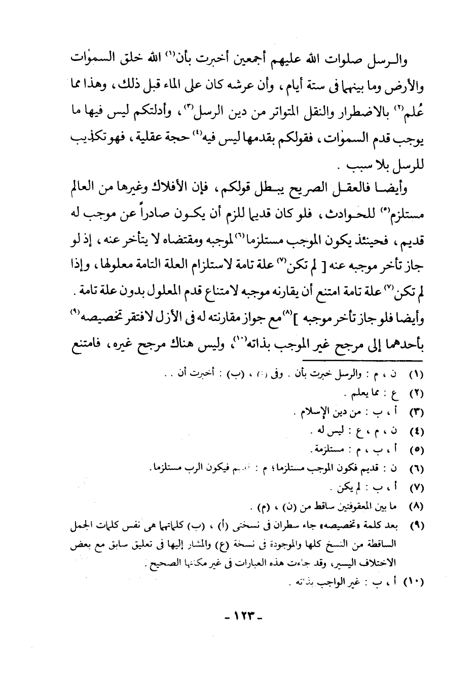 (¬10) بَعْدَ كَلِمَةِ تَخْصِيصِهِ جَاءَ سَطْرَانِ فِي نُسْخَتَيْ (أ) ، (ب) كَلِمَاتُهُمَا هِيَ نَفْسُ كَلِمَاتِ الْجُمَلِ السَّاقِطَةِ مِنَ النُّسَخِ كُلِّهَا وَالْمَوْجُودَةِ فِي نُسْخَةِ (ع) وَالْمُشَارِ إِلَيْهَا فِي تَعْلِيقٍ سَابِقٍ مَعَ بَعْضِ الِاخْتِلَافِ الْيَسِيرِ، وَقَدْ جَاءَتْ هَذِهِ الْعِبَارَاتُ فِي غَيْرِ مَكَانِهَا الصَّحِيحِ.