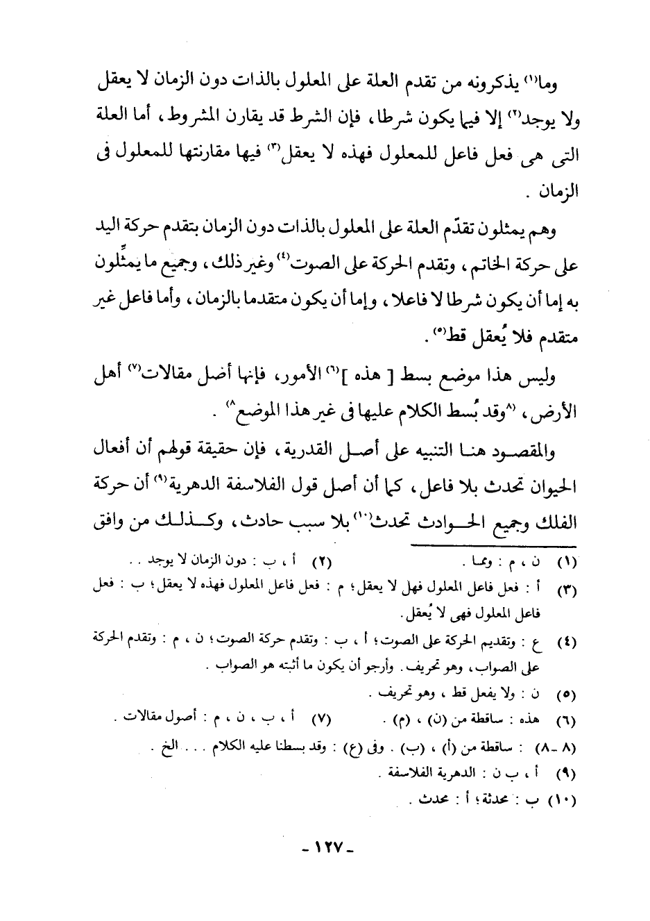 وَمَا (¬1) يَذْكُرُونَهُ مِنْ تَقَدُّمِ الْعِلَّةِ عَلَى الْمَعْلُولِ بِالذَّاتِ دُونَ الزَّمَانِ لَا يُعْقَلُ وَلَا يُوجَدُ (¬2) إِلَّا فِيمَا يَكُونُ شَرْطًا، فَإِنَّ الشَّرْطَ قَدْ يُقَارِنُ الْمَشْرُوطَ، أَمَّا الْعِلَّةُ الَّتِي هِيَ فِعْلُ فَاعِلٍ لِلْمَعْلُولِ فَهَذِهِ لَا يُعْقَلُ (¬3) فِيهَا مُقَارَنَتُهَا لِلْمَعْلُولِ فِي الزَّمَانِ.