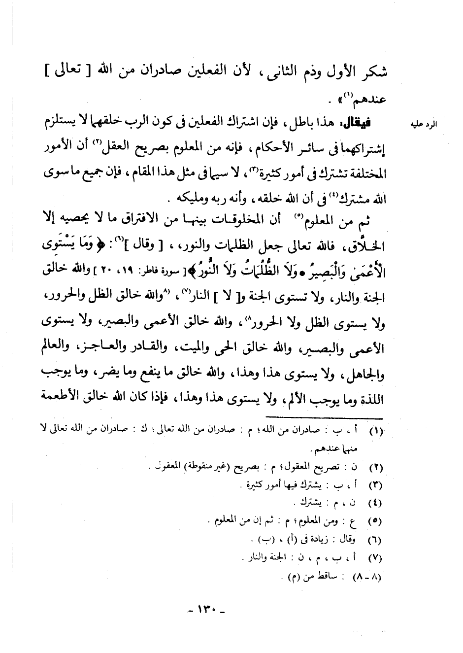 فَيُقَالُ: هَذَا بَاطِلٌ، فَإِنَّ اشْتِرَاكَ الْفِعْلَيْنِ فِي كَوْنِ الرَّبِّ خَلَقَهُمَا لَا يَسْتَلْزِمُ اشْتِرَاكَهُمَا فِي سَائِرِ الْأَحْكَامِ، فَإِنَّهُ مِنَ الْمَعْلُومِ بِصَرِيحِ الْعَقْلِ (¬2) أَنَّ الْأُمُورَ الْمُخْتَلِفَةَ تَشْتَرِكُ فِي أُمُورٍ كَثِيرَةٍ (¬3) لَا سِيَّمَا فِي مِثْلِ هَذَا الْمَقَامِ، فَإِنَّ جَمِيعَ مَا سِوَى اللَّهِ مُشْتَرِكٌ (¬4) فِي أَنَّ اللَّهَ خَلَقَهُ، وَأَنَّهُ رَبُّهُ وَمَلِيكُهُ.