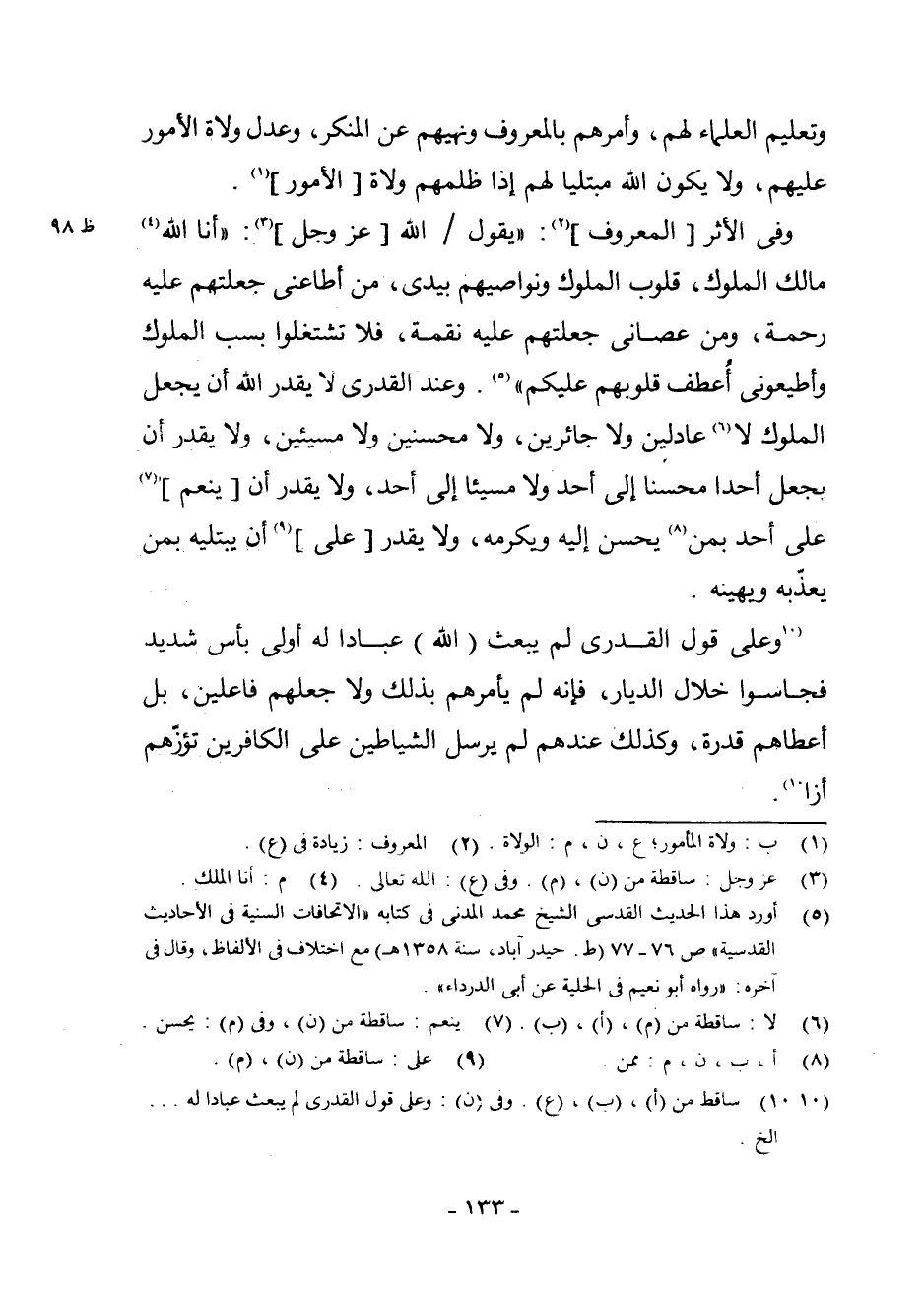 وَفِي الْأَثَرِ [الْمَعْرُوفِ] (¬2) : " «يَقُولُ اللَّهُ [عَزَّ وَجَلَّ] (¬3) : " أَنَا اللَّهُ (¬4) مَالِكُ الْمُلُوكِ، قُلُوبُ الْمُلُوكِ وَنَوَاصِيهِمْ بِيَدِي، مَنْ أَطَاعَنِي جَعَلْتُهُمْ عَلَيْهِ رَحْمَةً، وَمَنْ عَصَانِي جَعَلْتُهُمْ عَلَيْهِ نِقْمَةً، فَلَا تَشْتَغِلُوا بِسَبِّ الْمُلُوكِ وَأَطِيعُونِي أَعْطِفْ قُلُوبَهُمْ عَلَيْكُمْ» (¬5) . وَعِنْدَ الْقَدَرِيِّ لَا يَقْدِرُ اللَّهُ أَنْ يَجْعَلَ الْمُلُوكَ لَا (¬6) عَادِلِينَ وَلَا جَائِرِينَ، وَلَا مُحْسِنِينَ وَلَا مُسِيئِينَ، وَلَا يَقْدِرُ أَنْ يَجْعَلَ أَحَدًا مُحْسِنًا إِلَى أَحَدٍ، وَلَا مُسِيئًا إِلَى أَحَدٍ، وَلَا يَقْدِرُ أَنْ [يُنْعِمَ] (¬7) عَلَى أَحَدٍ بِمَنْ (¬8) يُحْسِنُ إِلَيْهِ وَيُكْرِمُهُ، وَلَا يَقْدِرُ [عَلَى] (¬9) أَنْ يَبْتَلِيَهُ بِمَنْ يُعَذِّبُهُ وَيُهِينُهُ ".