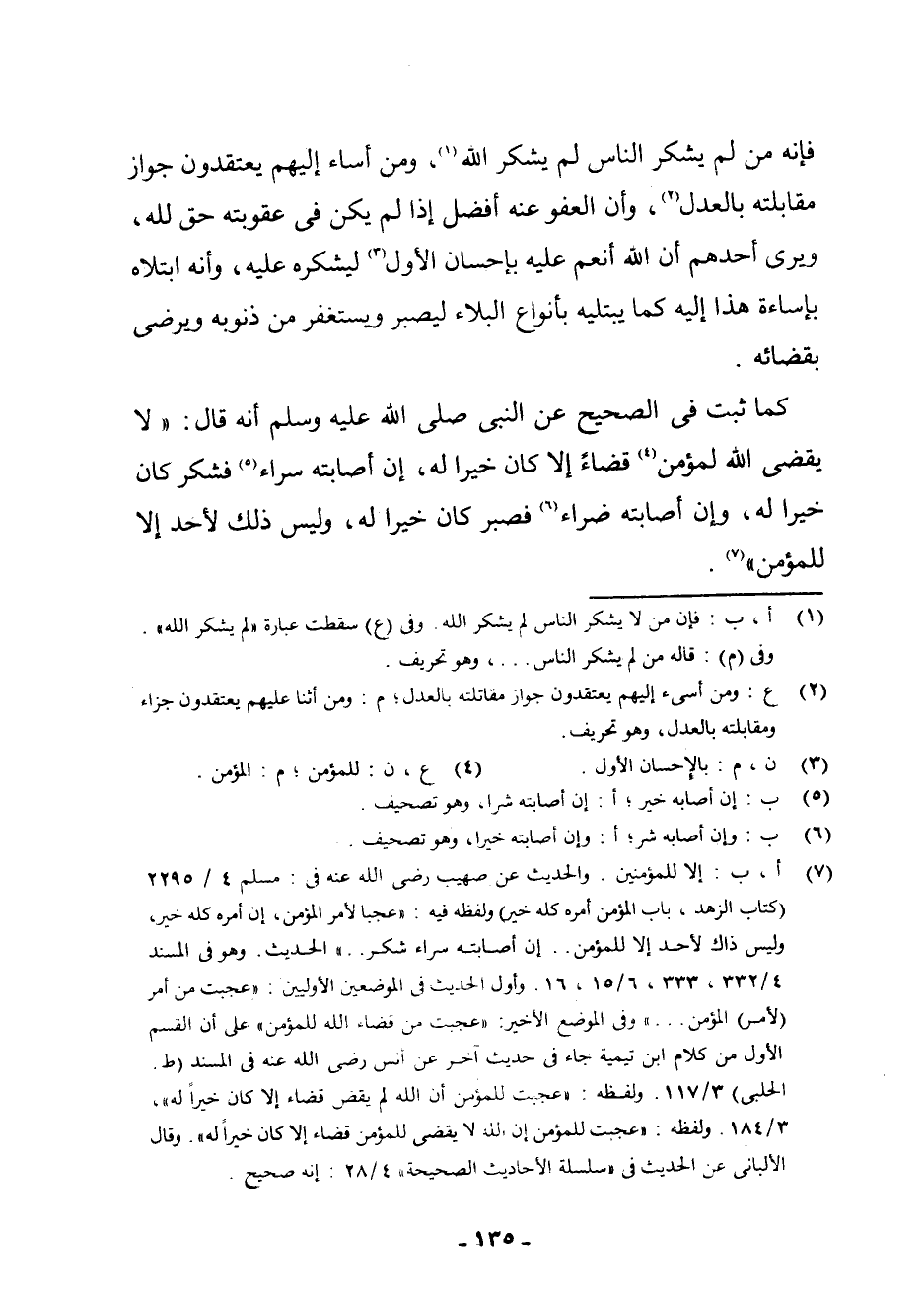 (¬6) أ، ب: إِلَّا لِلْمُؤْمِنِينَ، وَالْحَدِيثُ عَنْ صُهَيْبٍ رَضِيَ اللَّهُ عَنْهُ فِي مُسْلِمٍ 4/2295 كِتَابِ الزُّهْدِ، بَابِ الْمُؤْمِنُ أَمْرُهُ كُلُّهُ خَيْرٌ، وَلَفْظُهُ فِيهِ: عَجَبًا لِأَمْرِ الْمُؤْمِنِ، إِنَّ أَمْرَهُ كُلَّهُ خَيْرٌ وَلَيْسَ ذَاكَ لِأَحَدٍ إِلَّا لِلْمُؤْمِنِ، إِنْ أَصَابَتْهُ سَرَّاءُ شَكَرَ. الْحَدِيثَ. وَهُوَ فِي الْمُسْنَدِ 4/332، 333، 6/15، 16، وَأَوَّلُ الْحَدِيثِ فِي الْمَوْضِعَيْنِ الْأَوَّلَيْنِ، عَجِبْتُ مِنْ أَمْرِ (لِأَمْرِ) الْمُؤْمِنِ، وَفِي الْمَوْضِعِ الْأَخِيرِ: عَجِبْتُ مِنْ قَضَاءِ اللَّهِ لِلْمُؤْمِنِ. عَلَى أَنَّ الْقِسْمَ الْأَوَّلَ مِنْ كَلَامِ ابْنِ تَيْمِيَةَ جَاءَ فِي حَدِيثٍ آخَرَ عَنْ أَنَسٍ رَضِيَ اللَّهُ عَنْهُ فِي الْمُسْنَدِ ط الْحَلَبِيِّ 3 117 وَلَفْظُهُ: عَجِبْتُ لِلْمُؤْمِنِ، إِنَّ اللَّهَ لَمْ يَقْضِ قَضَاءً إِلَّا كَانَ خَيْرًا لَهُ، 3/184، وَلَفْظُهُ: عَجِبْتُ لِلْمُؤْمِنِ، إِنَّ اللَّهَ لَا يَقْضِي لِلْمُؤْمِنِ قَضَاءً إِلَّا كَانَ خَيْرًا لَهُ. وَقَالَ الْأَلْبَانِيُّ عَنِ الْحَدِيثِ فِي سِلْسِلَةِ الْأَحَادِيثِ الصَّحِيحَةِ 4/28 إِنَّهُ صَحِيحٌ.