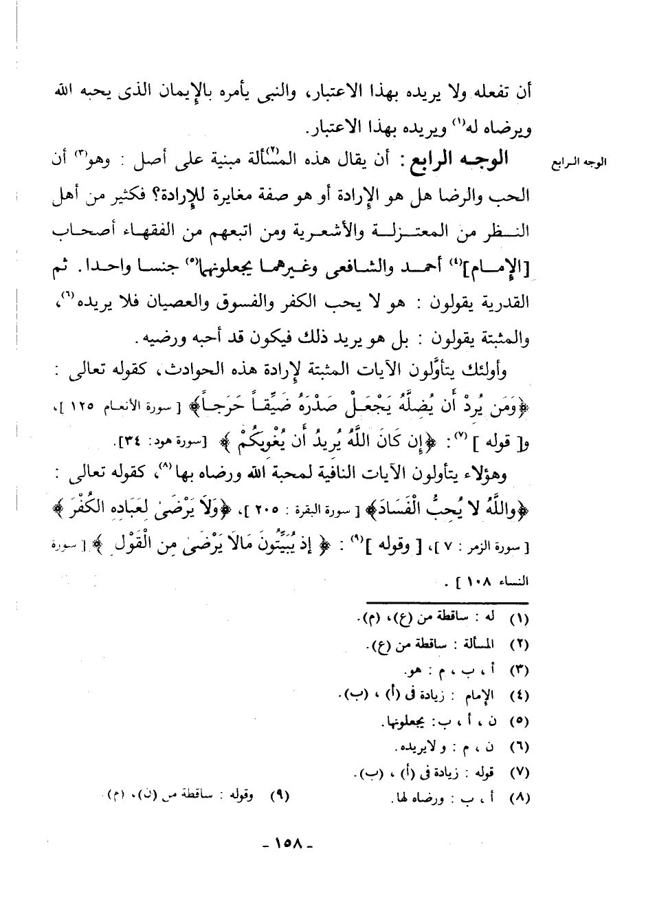 الْوَجْهُ الرَّابِعُ: أَنَّ يُقَالَ هَذِهِ الْمَسْأَلَةُ (¬2) مَبْنِيَّةٌ عَلَى أَصْلٍ: وَهُوَ (¬3) أَنَّ الْحُبَّ وَالرِّضَا هَلْ هُوَ الْإِرَادَةُ أَوْ هُوَ صِفَةٌ مُغَايِرَةٌ لِلْإِرَادَةِ؟ فَكَثِيرٌ مِنْ أَهْلِ النَّظَرِ مِنَ الْمُعْتَزِلَةِ وَالْأَشْعَرِيَّةِ وَمَنِ اتَّبَعَهُمْ مِنَ الْفُقَهَاءِ مِنْ أَصْحَابِ [الْإِمَامِ] (¬4) أَحْمَدَ وَالشَّافِعِيِّ وَغَيْرِهِمَا يَجْعَلُونَهُمَا (¬5) جِنْسًا وَاحِدًا. ثُمَّ الْقَدَرِيَّةُ يَقُولُونَ: بَلْ هُوَ لَا يُحِبُّ الْكُفْرَ وَالْفُسُوقَ وَالْعِصْيَانَ فَلَا يُرِيدُهُ (¬6) ، وَالْمُثْبِتَةُ يَقُولُونَ: بَلْ هُوَ يُرِيدُ ذَلِكَ فَيَكُونُ قَدْ أَحَبَّهُ وَرَضِيَهُ.