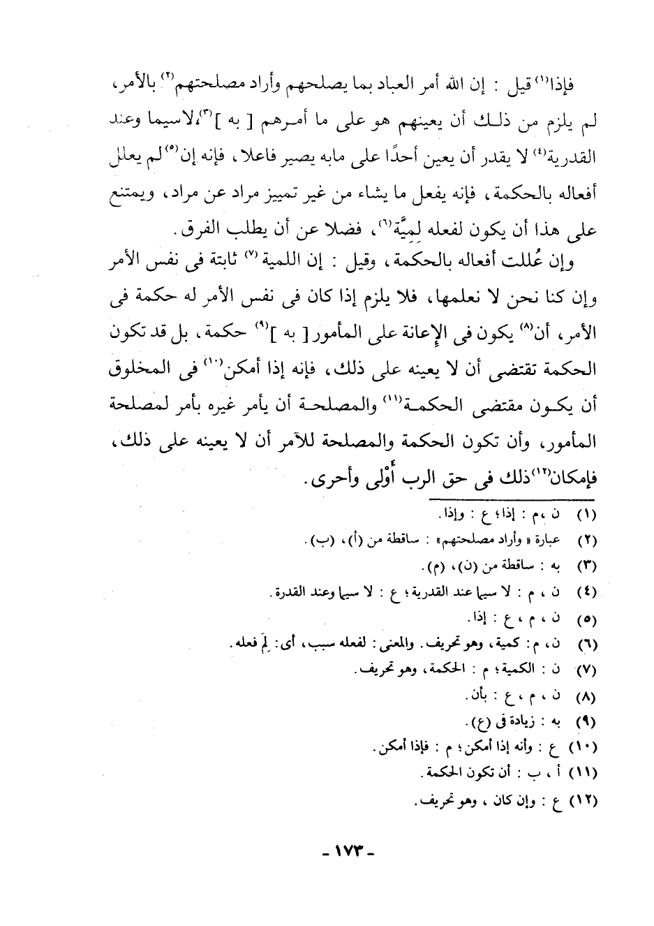 وَإِنْ عُلِّلَتْ أَفْعَالُهُ بِالْحِكْمَةِ، وَقِيلَ إِنَّ اللِّمِيَّةَ (¬7) ثَابِتَةٌ فِي نَفْسِ الْأَمْرِ وَإِنْ كُنَّا نَحْنُ لَا نَعْلَمُهَا فَلَا يَلْزَمُ إِذَا كَانَ فِي نَفْسِ الْأَمْرِ لَهُ حِكْمَةٌ فِي الْأَمْرِ، أَنْ (¬8) يَكُونَ فِي الْإِعَانَةِ عَلَى الْمَأْمُورِ [بِهِ] (¬9) حِكْمَةٌ، بَلْ قَدْ تَكُونُ الْحِكْمَةُ تَقْتَضِي أَنْ لَا يُعِينُهُ عَلَى ذَلِكَ، فَإِنَّهُ إِذَا أَمْكَنَ (¬10) فِي الْمَخْلُوقِ أَنْ يَكُونَ مُقْتَضَى الْحِكْمَةِ (¬11) وَالْمَصْلَحَةِ أَنْ يَأْمُرَ غَيْرَهُ بِأَمْرٍ لِمَصْلَحَةِ الْمَأْمُورِ، وَأَنْ تَكُونَ الْحِكْمَةُ وَالْمَصْلَحَةُ لِلْآمِرِ أَنْ لَا يُعِينُهُ عَلَى ذَلِكَ، فَإِمْكَانُ (¬12) ذَلِكَ فِي حَقِّ الرَّبِّ أَوْلَى وَأَحْرَى.