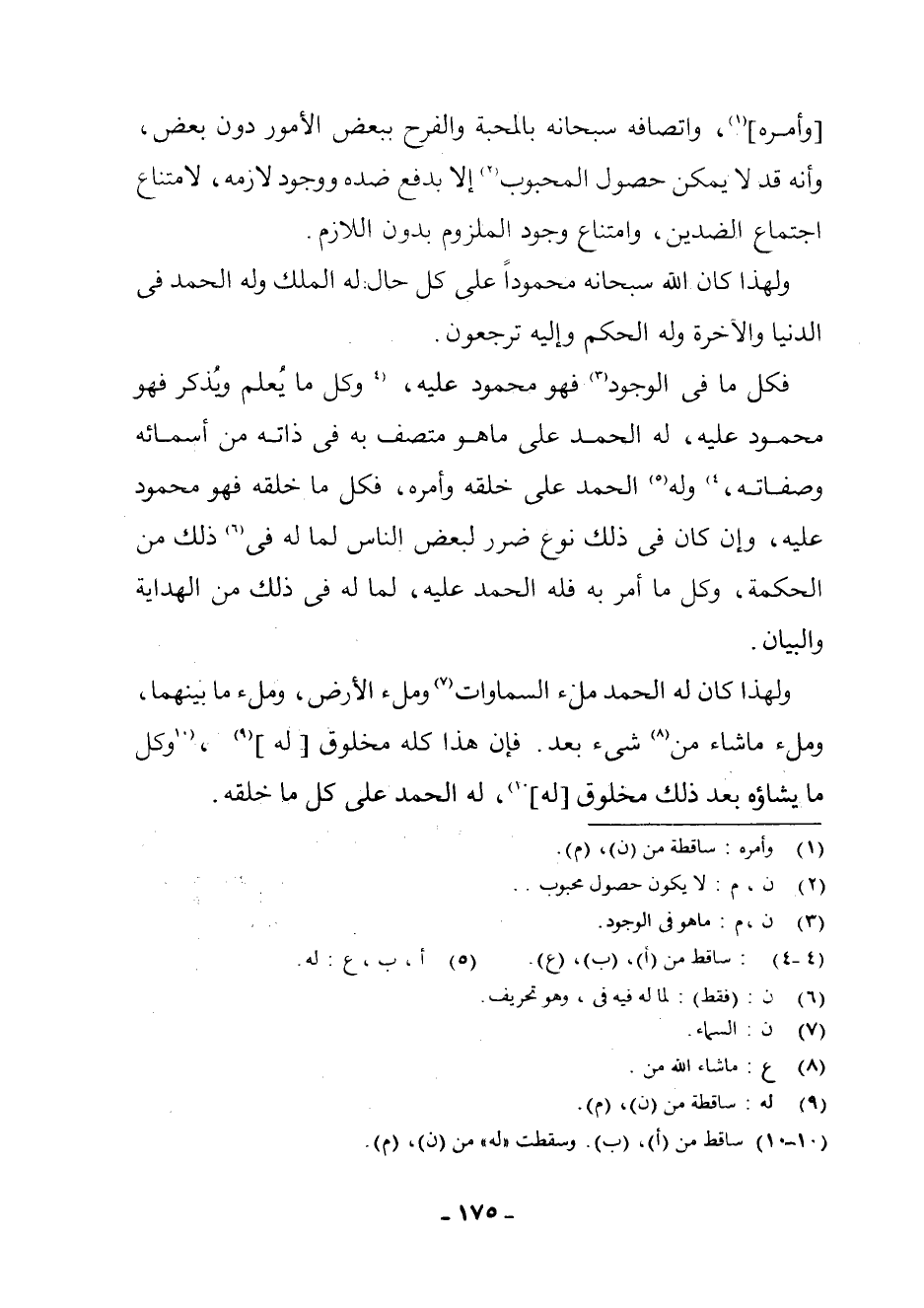 وَلِهَذَا كَانَ لَهُ الْحَمْدُ مَلْءَ السَّمَاوَاتِ (¬7) وَمَلْءَ الْأَرْضِ وَمَلْءَ مَا بَيْنَهُمَا، وَمَلْءَ مَا شَاءَ مِنْ (¬8) شَيْءٍ بَعْدُ. فَإِنَّ هَذَا كُلَّهُ مَخْلُوقٌ [لَهُ] (¬9) ، وَكُلُّ مَا يَشَاؤُهُ بَعْدَ ذَلِكَ مَخْلُوقٌ [لَهُ] (¬10) ، لَهُ الْحَمْدُ عَلَى كُلِّ مَا خَلَقَهُ.