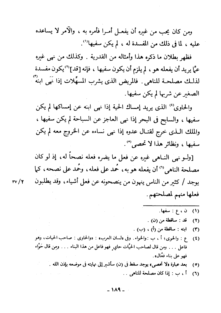 وَالْحَاوِي (¬4) الَّذِي يُرِيدُ إِمْسَاكَ الْحَيَّةِ إِذَا نَهَى ابْنَهُ عَنْ إِمْسَاكِهَا لَمْ يَكُنْ سَفِيهًا، وَالسَّابِحُ فِي الْبَحْرِ إِذَا نَهَى الْعَاجِزَ عَنِ السِّبَاحَةِ لَمْ يَكُنْ سَفِيهًا، وَالْمَلِكُ الَّذِي خَرَجَ لِقِتَالِ عَدُوِّهِ إِذَا نَهَى نِسَاءَهُ عَنِ الْخُرُوجِ مَعَهُ لَمْ يَكُنْ سَفِيهًا، وَنَظَائِرُ هَذَا لَا تُحْصَى (¬5) .