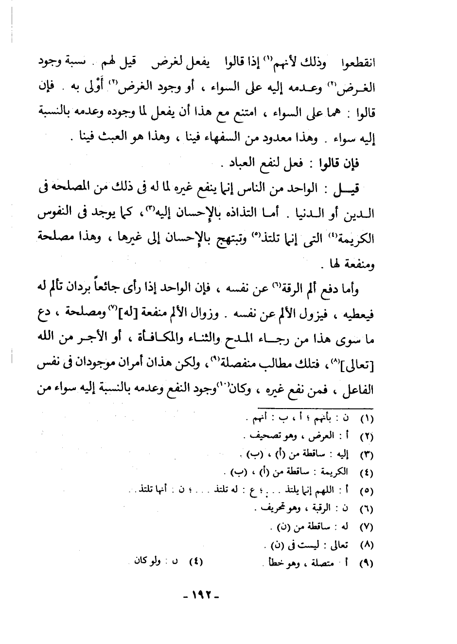 وَأَمَّا دَفْعُ أَلَمِ الرِّقَّةِ (¬7) عَنْ نَفْسِهِ، فَإِنَّ الْوَاحِدَ إِذَا رَأَى جَائِعًا بَرْدَانَ تَأَلَّمَ لَهُ فَيُعْطِيهِ، فَيَزُولُ الْأَلَمُ عَنْ نَفْسِهِ. وَزَوَالُ الْأَلَمِ مَنْفَعَةٌ [لَهُ] (¬8) وَمَصْلَحَةٌ، دَعْ مَا سِوَى هَذَا مِنْ رَجَاءِ الْمَدْحِ وَالثَّنَاءِ وَالْمُكَافَأَةِ، أَوِ الْأَجْرِ مِنَ اللَّهِ [تَعَالَى] (¬9) فَتِلْكَ مَطَالِبُ مُنْفَصِلَةٌ (¬10) ، وَلَكِنْ هَذَانِ أَمْرَانِ مَوْجُودَانِ فِي نَفْسِ الْفَاعِلِ، فَمَنْ نَفَعَ غَيْرَهُ، وَكَانَ (¬11) وُجُودُ النَّفْعِ وَعَدَمُهُ بِالنِّسْبَةِ إِلَيْهِ سَوَاءً مِنْ