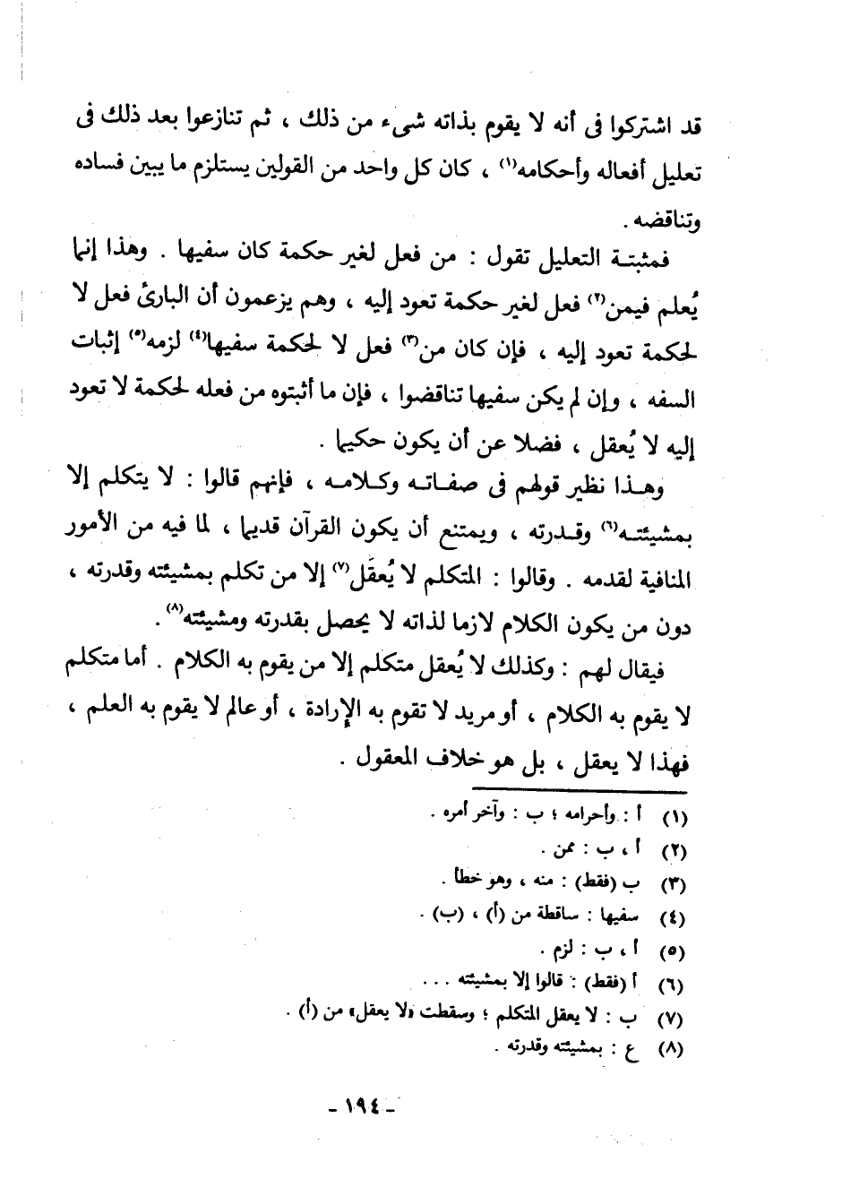 قَدِ اشْتَرَكُوا فِي أَنَّهُ لَا يَقُومُ بِذَاتِهِ شَيْءٌ مِنْ ذَلِكَ، ثُمَّ تَنَازَعُوا بَعْدَ ذَلِكَ فِي تَعْلِيلِ أَفْعَالِهِ وَأَحْكَامِهِ (¬1) ، كَانَ كُلُّ وَاحِدٍ مِنَ الْقَوْلَيْنِ يَسْتَلْزِمُ مَا يُبَيِّنُ فَسَادَهُ وَتَنَاقُضَهُ.