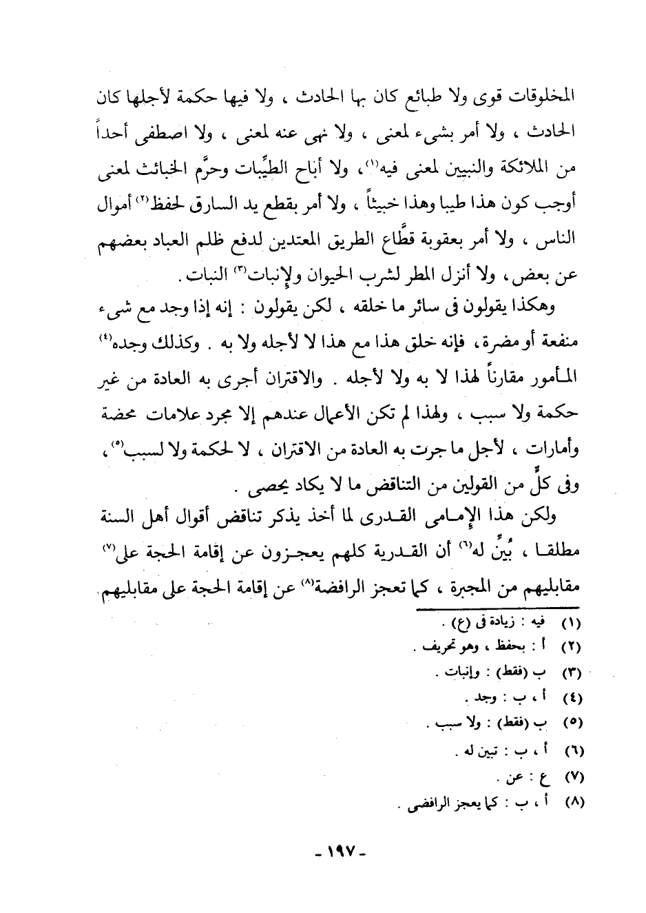 وَهَكَذَا يَقُولُونَ فِي سَائِرِ مَا خَلَقَهُ، لَكِنْ يَقُولُونَ إِنَّهُ إِذَا وَجَدَ مَعَ شَيْءٍ مَنْفَعَةً أَوْ مَضَرَّةً، فَإِنَّهُ خَلَقَ هَذَا مَعَ هَذَا لَا لِأَجْلِهِ وَلَا بِهِ. وَكَذَلِكَ وَجَدَهُ (¬4) الْمَأْمُورُ مُقَارِنًا لِهَذَا لَا بِهِ وَلَا لِأَجْلِهِ. وَالِاقْتِرَانُ أَجْرَى بِهِ الْعَادَةَ مِنْ غَيْرِ حِكْمَةٍ وَلَا سَبَبٍ، وَلِهَذَا لَمْ تَكُنِ الْأَعْمَالُ عِنْدَهُمْ إِلَّا مُجَرَّدَ عَلَامَاتٍ مَحْضَةٍ وَأَمَارَاتٍ، لِأَجْلِ مَا جَرَتْ بِهِ الْعَادَةُ مِنَ الِاقْتِرَانِ، لَا لِحِكْمَةٍ وَلَا لِسَبَبٍ (¬5) ، وَفِي كُلٍّ مِنَ الْقَوْلَيْنِ مِنَ التَّنَاقُضِ مَا لَا يَكَادُ يُحْصَى.