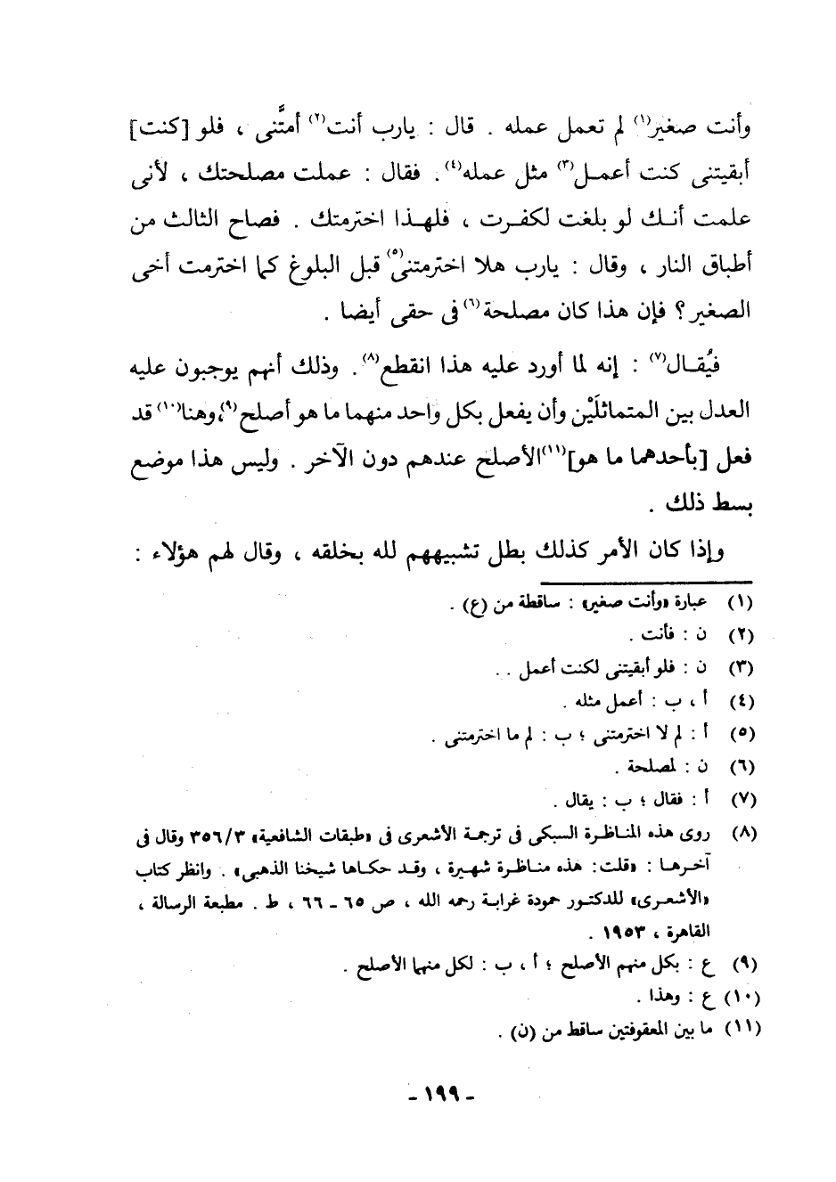 (¬8) رَوَى هَذِهِ الْمُنَاظَرَةَ السُّبْكِيُّ فِي تَرْجَمَةِ الْأَشْعَرِيِّ فِي طَبَقَاتِ الشَّافِعِيَّةِ 3 356 وَقَالَ فِي آخِرِهَا: قُلْتُ: هَذِهِ مُنَاظَرَةٌ شَهِيرَةٌ، وَقَدْ حَكَاهَا شَيْخُنَا الذَّهَبِيُّ، وَانْظُرْ كِتَابَ الْأَشْعَرِيِّ لِلدُّكْتُورِ حَمُّودَة غَرَابَة رَحِمَهُ اللَّهُ، ص [0 - 9] 5 - 66 ط، مَطْبَعَةِ الرِّسَالَةِ، الْقَاهِرَةِ، 1953.