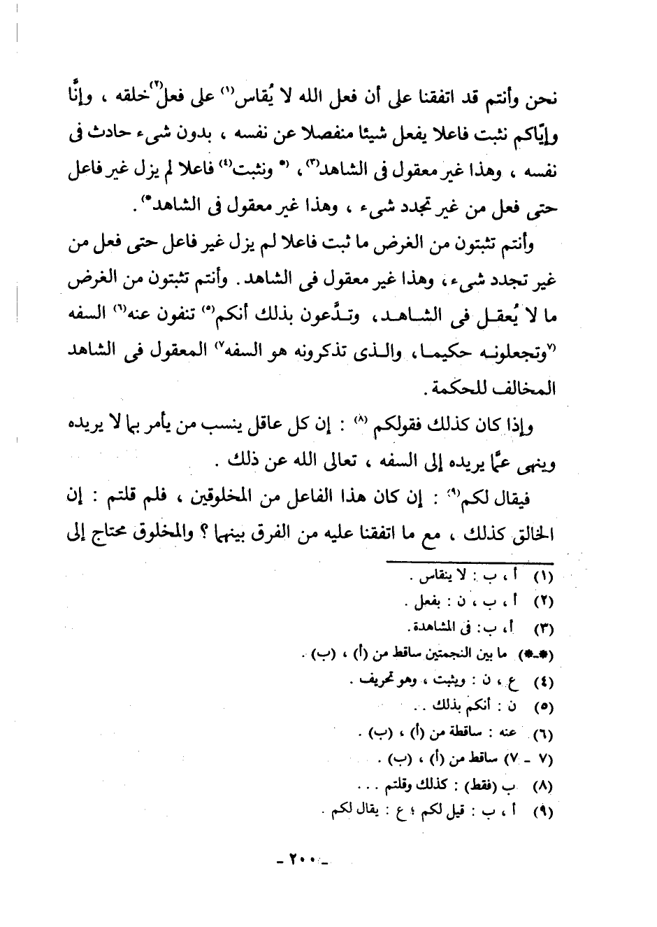 وَأَنْتُمْ تُثْبِتُونَ مِنَ الْغَرَضِ مَا ثَبَتَ فَاعِلًا لَمْ يَزَلْ غَيْرَ فَاعِلٍ حَتَّى فَعَلَ مِنْ غَيْرِ تَجَدُّدِ شَيْءٍ، وَهَذَا غَيْرُ مَعْقُولٍ فِي الشَّاهِدِ. وَأَنْتُمْ تُثْبِتُونَ مِنَ الْغَرَضِ مَا لَا يُعْقَلُ فِي الشَّاهِدِ، وَتَدَّعُونَ بِذَلِكَ أَنَّكُمْ (¬6) تَنْفُونَ عَنْهُ (¬7) السَّفَهَ وَتَجْعَلُونَهُ حَكِيمًا، وَالَّذِي تَذْكُرُونَهُ هُوَ السَّفَهُ (¬8) الْمَعْقُولُ فِي الشَّاهِدِ الْمُخَالِفِ لِلْحِكْمَةِ.