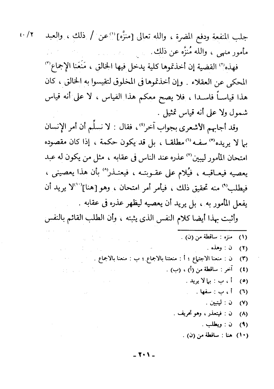 وَقَدْ أَجَابَهُمُ الْأَشْعَرِيُّ بِجَوَابٍ آخَرَ (¬4) ، فَقَالَ: لَا نُسَلِّمُ أَنَّ أَمْرَ الْإِنْسَانِ بِمَا لَا يُرِيدُهُ (¬5) سَفَهٌ (¬6) مُطْلَقًا، بَلْ قَدْ يَكُونُ حِكْمَةً، إِذَا كَانَ مَقْصُودُهُ امْتِحَانَ الْمَأْمُورِ لِيُبَيِّنَ (¬7) عُذْرَهُ عِنْدَ النَّاسِ فِي عِقَابِهِ، مِثْلَ مَنْ يَكُونُ لَهُ عَبْدٌ يَعْصِيهِ فَيُعَاقِبُهُ، فَيُلَامُ عَلَى عُقُوبَتِهِ، فَيَعْتَذِرُ (¬8) بِأَنَّ هَذَا يَعْصِينِي، فَيُطْلَبُ (¬9) مِنْهُ تَحْقِيقُ ذَلِكَ، فَيَأْمُرُ أَمْرَ امْتِحَانٍ، وَهُوَ [هُنَا] (¬10) لَا يُرِيدُ أَنْ يَفْعَلَ الْمَأْمُورَ بِهِ، بَلْ يُرِيدُ أَنْ يَعْصِيَهُ لِيَظْهَرَ عُذْرُهُ فِي عِقَابِهِ.