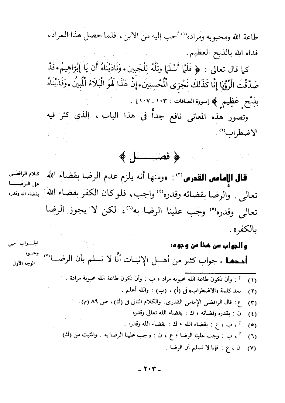 (فَصْلٌ) قَالَ الْإِمَامِيُّ الْقَدَرِيُّ (¬3) : " وَمِنْهَا أَنَّهُ يَلْزَمُ عَدَمُ الرِّضَا بِقَضَاءِ اللَّهِ تَعَالَى، وَالرِّضَا بِقَضَائِهِ وَقَدَرِهِ (¬4) وَاجِبٌ، فَلَوْ كَانَ الْكُفْرُ بِقَضَاءِ اللَّهِ تَعَالَى وَقَدَرِهِ (¬5) وَجَبَ عَلَيْنَا الرِّضَا بِهِ (¬6) ، لَكِنْ لَا يَجُوزُ الرِّضَا بِالْكُفْرِ ".