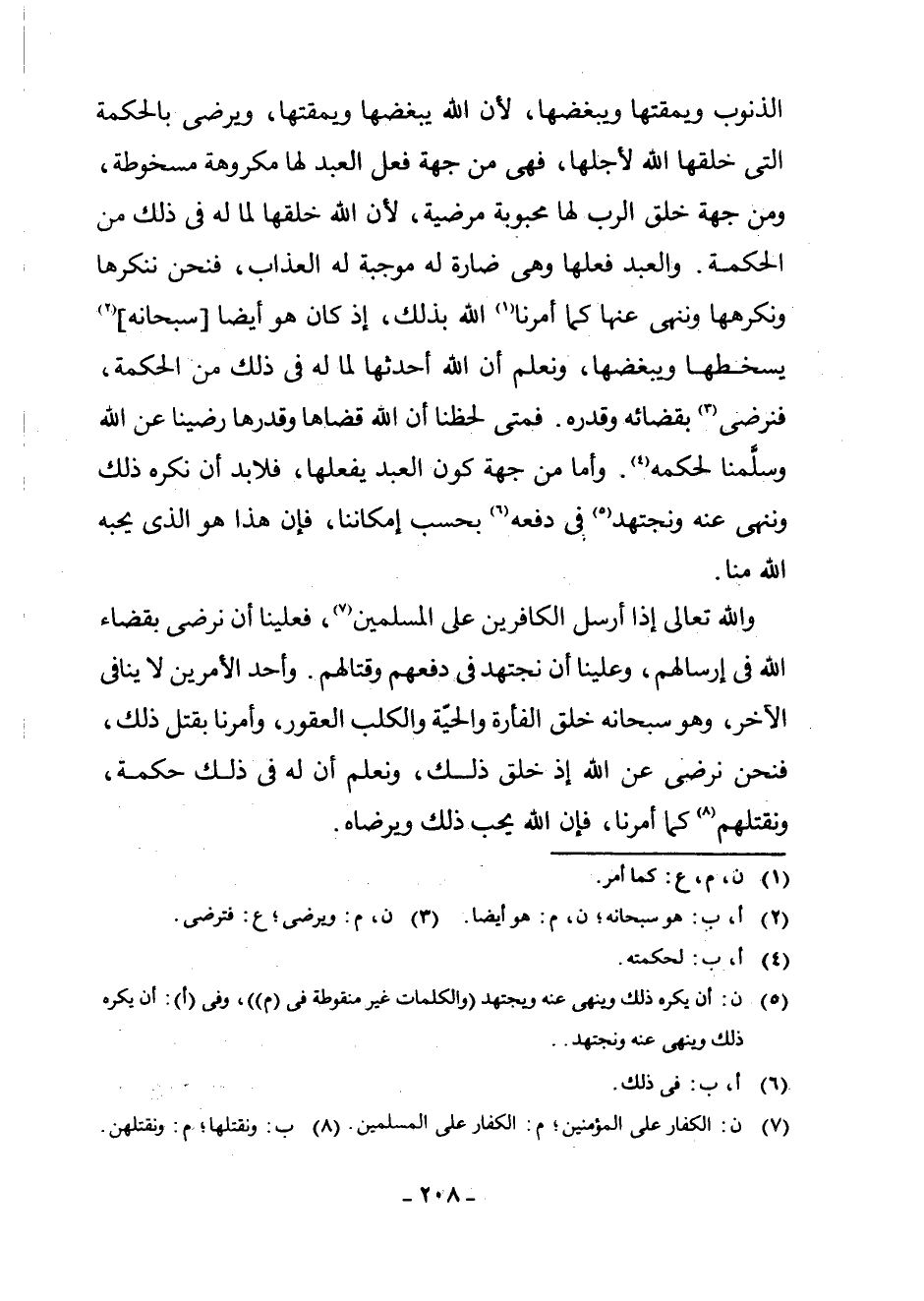 وَاللَّهُ تَعَالَى إِذَا أَرْسَلَ الْكَافِرِينَ عَلَى الْمُسْلِمِينَ (¬7) ، فَعَلَيْنَا أَنْ نَرْضَى بِقَضَاءِ اللَّهِ فِي إِرْسَالِهِمْ، وَعَلَيْنَا أَنْ نَجْتَهِدَ فِي دَفْعِهِمْ وَقِتَالِهِمْ. وَأَحَدُ الْأَمْرَيْنِ لَا يُنَافِي الْآخَرَ وَهُوَ سُبْحَانَهُ خَلَقَ الْفَأْرَةَ وَالْحَيَّةَ وَالْكَلْبَ الْعَقُورَ، وَأَمَرَنَا بِقَتْلِ ذَلِكَ، فَنَحْنُ نَرْضَى عَنِ اللَّهِ إِذْ خَلَقَ ذَلِكَ، وَنَعْلَمُ أَنَّ لَهُ فِي ذَلِكَ حِكْمَةً، وَنَقْتُلُهُمْ (¬8) كَمَا أَمَرَنَا، فَإِنَّ اللَّهَ يُحِبُّ ذَلِكَ وَيَرْضَاهُ.
