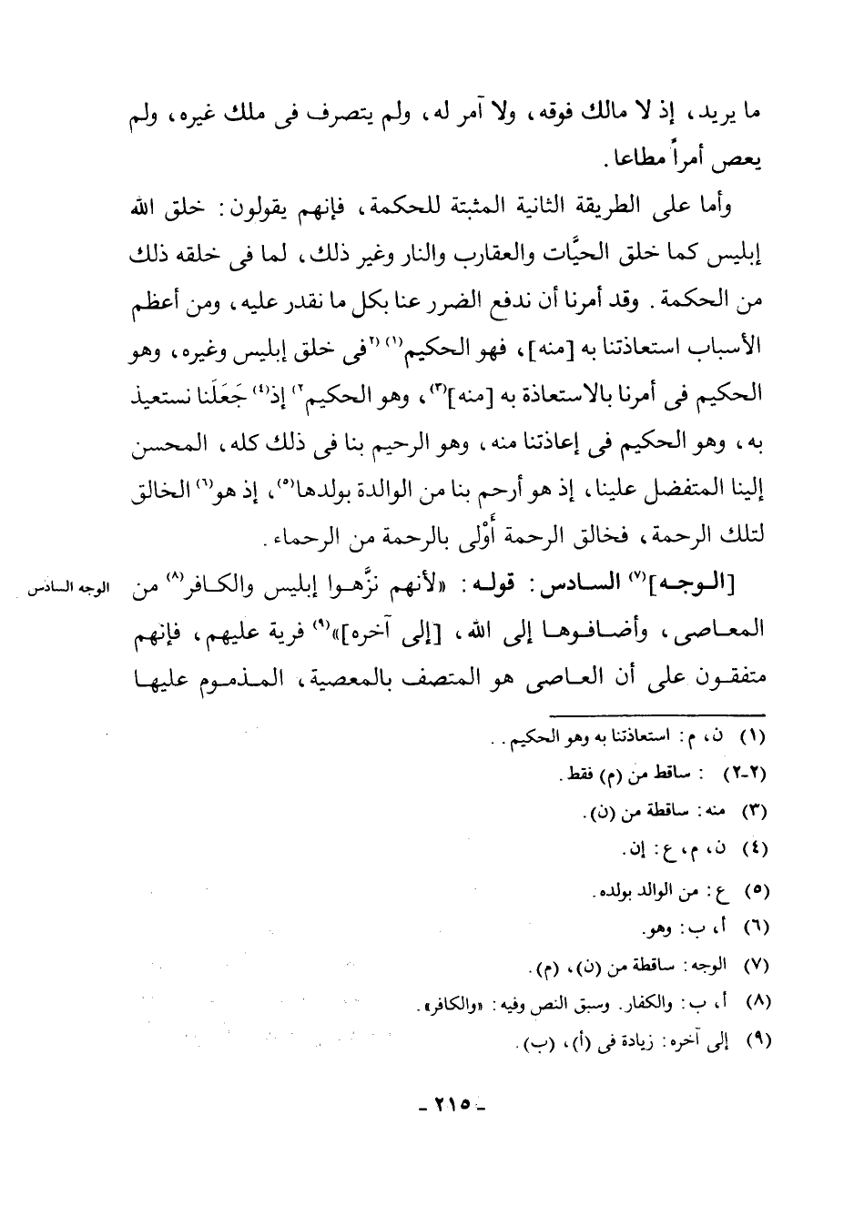 الْوَجْهُ (¬7) السَّادِسُ: قَوْلُهُ: " لِأَنَّهُمْ نَزَّهُوا إِبْلِيسَ وَالْكَافِرَ (¬8) مِنَ الْمَعَاصِي، وَأَضَافُوهَا إِلَى اللَّهِ، [إِلَى آخِرِهِ] " (¬9) - فِرْيَةٌ عَلَيْهِمْ، فَإِنَّهُمْ مُتَّفِقُونَ عَلَى أَنَّ الْعَاصِيَ هُوَ الْمُتَّصِفُ بِالْمَعْصِيَةِ، الْمَذْمُومِ عَلَيْهَا