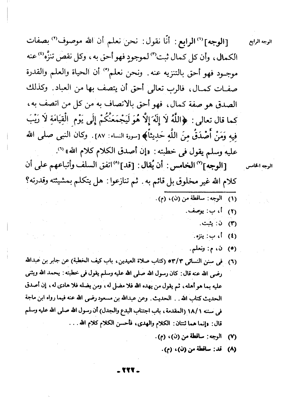 [الْوَجْهُ] (¬7) الْخَامِسُ: أَنْ يُقَالَ: [قَدِ] (¬8) اتَّفَقَ السَّلَفُ وَأَتْبَاعُهُمْ عَلَى أَنَّ كَلَامَ اللَّهِ غَيْرُ مَخْلُوقٍ بَلْ قَائِمٌ بِهِ. ثُمَّ تَنَازَعُوا: هَلْ يَتَكَلَّمُ بِمَشِيئَتِهِ وَقُدْرَتِهِ؟