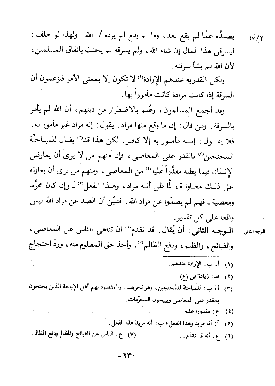 (¬3) أ، ب: لِلْمُبَاحَثَةِ لِلْمُحْتَجِّينَ، وَهُوَ تَحْرِيفٌ، وَالْمَقْصُودُ بِهِمْ أَهْلُ الْإِبَاحَةِ الَّذِينَ يَحْتَجُّونَ بِالْقَدَرِ عَلَى الْمَعَاصِي وَيُبِيحُونَ الْمُحَرَّمَاتِ.