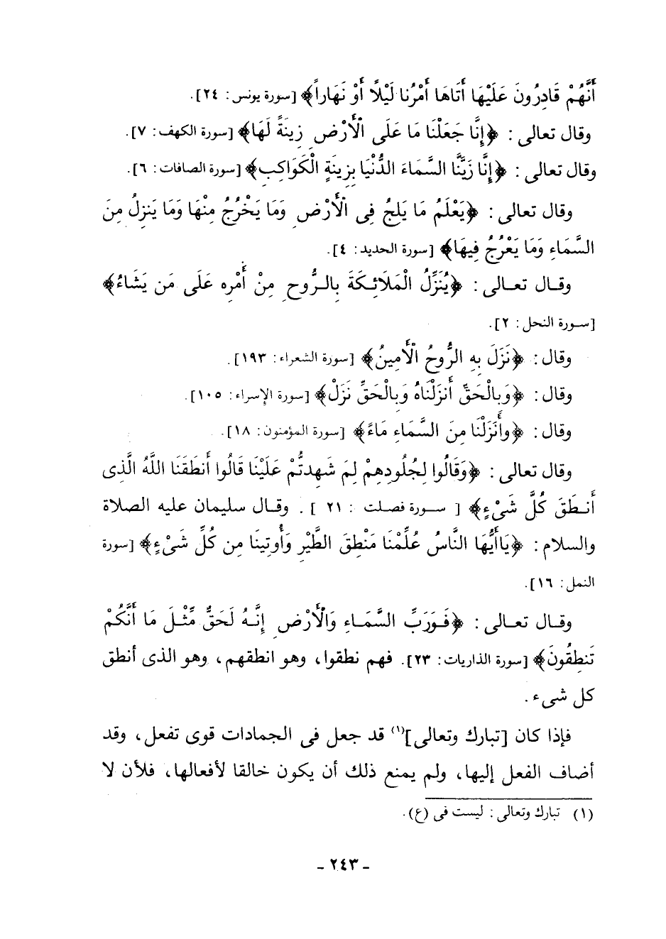 وَقَالَ تَعَالَى: {فَوَرَبِّ السَّمَاءِ وَالْأَرْضِ إِنَّهُ لَحَقٌّ مِثْلَ مَا أَنَّكُمْ تَنْطِقُونَ} [سُورَةُ الذَّارِيَاتِ: 23] ، فَهُمْ نَطَقُوا وَهُوَ أَنْطَقَهُمْ، وَهُوَ الَّذِي أَنْطَقَ كُلَّ شَيْءٍ.
