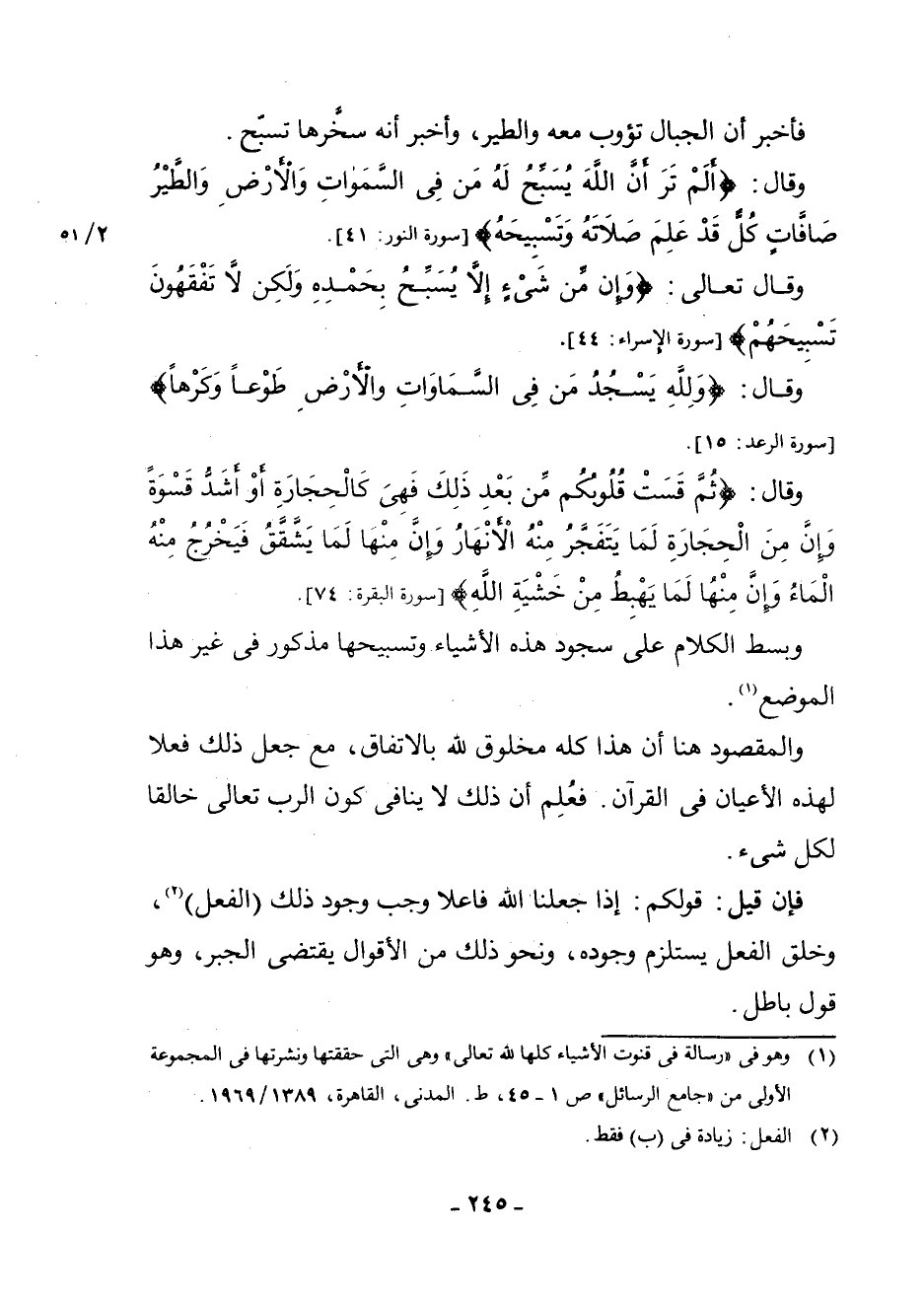 (¬1) وَهُوَ فِي " رِسَالَةٌ فِي قُنُوتِ الْأَشْيَاءِ كُلِّهَا لِلَّهِ تَعَالَى " وَهِيَ الَّتِي حَقَّقْتُهَا وَنَشَرْتُهَا فِي الْمَجْمُوعَةِ الْأُولَى مِنْ " جَامِعِ الرَّسَائِلِ " ص [0 - 9]- 45 ط الْمَدَنِيِّ الْقَاهِرَةِ، 1389 1969.