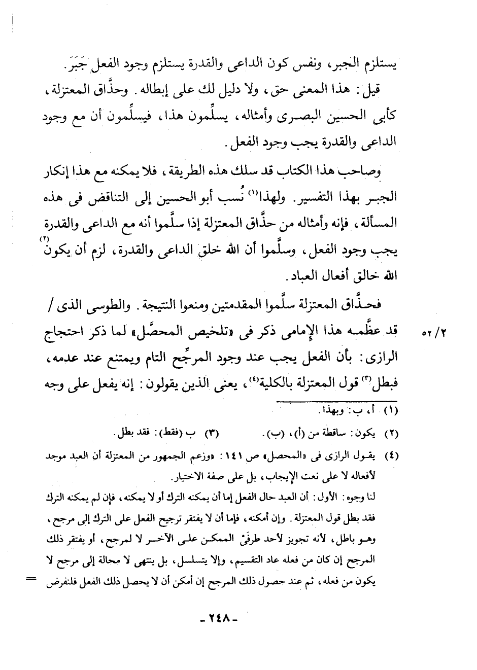 (¬4) يَقُولُ الرَّازِيُّ فِي " الْمُحَصِّلِ " ص 141: وَزَعَمَ الْجُمْهُورُ مِنَ الْمُعْتَزِلَةِ أَنَّ الْعَبْدَ مُوجِدٌ لِأَفْعَالِهِ لَا عَلَى نَعْتِ الْإِيجَابِ بَلْ عَلَى صِفَةِ الِاخْتِيَارِ. لَنَا وُجُوهٌ: الْأَوَّلُ: أَنَّ الْعَبْدَ حَالَ الْفِعْلِ إِمَّا أَنْ يُمْكِنَهُ التَّرْكُ أَوْ لَا يُمْكِنَهُ، فَإِنْ لَمْ يُمْكِنْهُ التَّرْكُ فَقَدْ بَطَلَ قَوْلُ الْمُعْتَزِلَةِ، وَإِنْ أَمْكَنَهُ، فَإِمَّا أَنْ لَا يَفْتَقِرَ تَرْجِيحُ الْفِعْلِ عَلَى التَّرْكِ إِلَى مُرَجِّحٍ، وَهُوَ بَاطِلٌ، لِأَنَّهُ تَجْوِيزٌ لِأَحَدِ طَرَفَيِ الْمُمْكِنِ عَلَى الْآخَرِ لَا لِمُرَجِّحٍ، أَوْ يَفْتَقِرُ ذَلِكَ الْمُرَجِّحَ، إِنْ كَانَ مِنْ فِعْلِهِ عَادَ التَّقْسِيمُ، وَإِلَّا يَتَسَلْسَلُ، بَلْ يَنْتَهِي لَا مَحَالَةَ إِلَى مُرَجِّحٍ لَا يَكُونُ مِنْ فِعْلِهِ، ثُمَّ عِنْدَ حُصُولِ ذَلِكَ الْمُرَجِّحِ إِنْ أَمْكَنَ أَنْ لَا يَتَحَصَّلَ ذَلِكَ الْفِعْلُ فَلْنَفْرِضْ ذَلِكَ، وَحِينَئِذٍ يَحْصُلُ الْفِعْلُ تَارَةً، وَلَا يَحْصُلُ أُخْرَى، مَعَ أَنَّ نِسْبَةَ ذَلِكَ الْمُرَجِّحِ إِلَى الْوَقْتَيْنِ عَلَى السَّوَاءِ، فَاخْتِصَاصُ أَحَدِ الْوَقْتَيْنِ بِالْحُصُولِ، وَوَقْتِ الْآخَرِ بِعَدَمِ الْحُصُولِ، يَكُونُ تَرْجِيحًا لِأَحَدِ طَرَفَيِ الْمُمْكِنِ الْمُتَسَاوِي عَلَى الْآخَرِ مِنْ غَيْرِ مُرَجِّحٍ، وَهُوَ مُحَالٌ، وَإِنِ امْتَنَعَ أَنْ لَا يَحْصُلَ فَقَدْ بَطَلَ قَوْلُ الْمُعْتَزِلَةِ بِالْكُلِّيَّةِ، لِأَنَّهُ مَتَى حَصَلَ الْمُرَجِّحُ وَجَبَ الْفِعْلُ، وَمَتَى لَمْ يَحْصُلِ امْتَنَعَ، فَلَمْ يَكُنِ الْعَبْدُ مُسْتَقِلًّا بِالِاخْتِيَارِ، فَهَذَا كَلَامٌ قَاطِعٌ.