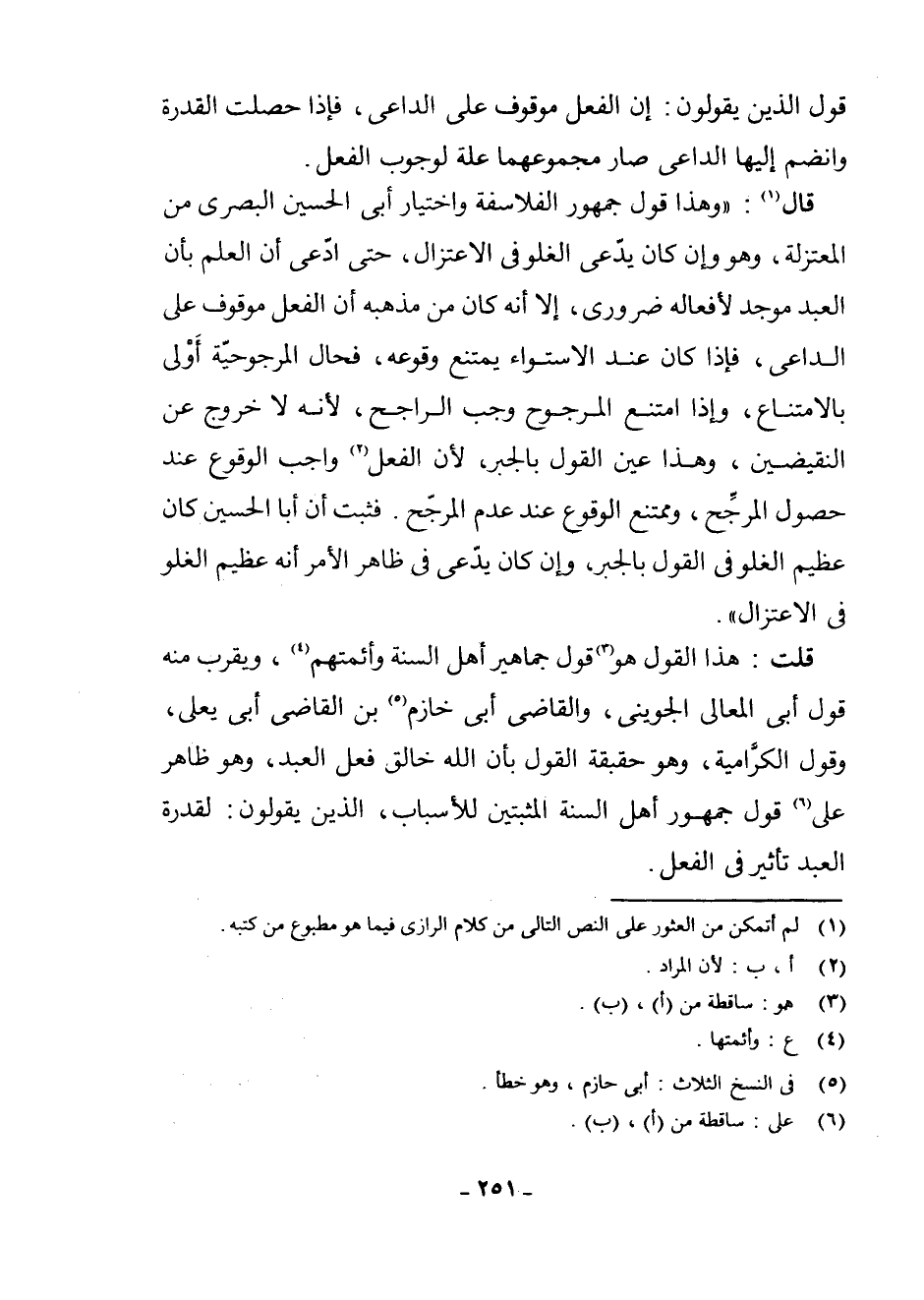 قَالَ (¬1) : وَهَذَا قَوْلُ جُمْهُورِ الْفَلَاسِفَةِ وَاخْتِيَارُ أَبِي الْحُسَيْنِ الْبَصْرِيِّ مِنَ الْمُعْتَزِلَةِ، وَهُوَ وَإِنْ كَانَ يَدَّعِي الْغُلُوَّ فِي الِاعْتِزَالِ، حَتَّى ادَّعَى أَنَّ الْعِلْمَ بِأَنَّ الْعَبْدَ مُوجِدٌ لِأَفْعَالِهِ ضَرُورِيٌّ، إِلَّا أَنَّهُ كَانَ مِنْ مَذْهَبِهِ أَنَّ الْفِعْلَ مَوْقُوفٌ عَلَى الدَّاعِي، فَإِذَا كَانَ عِنْدَ الِاسْتِوَاءِ يَمْتَنِعُ وُقُوعُهُ، فَحَالَ الْمَرْجُوحِيَّةِ أَوْلَى بِالِامْتِنَاعِ، وَإِذَا امْتَنَعَ الْمَرْجُوحُ وَجَبَ الرَّاجِحُ لِأَنَّهُ لَا خُرُوجَ عَنِ النَّقِيضَيْنِ وَهَذَا عَيْنُ الْقَوْلِ بِالْجَبْرِ، لِأَنَّ الْفِعْلَ (¬2) وَاجِبُ الْوُقُوعِ عِنْدَ حُصُولِ الْمُرَجِّحِ، وَمُمْتَنِعُ الْوُقُوعِ عِنْدَ عَدَمِ الْمُرَجِّحِ، فَثَبَتَ أَنَّ أَبَا الْحُسَيْنِ كَانَ عَظِيمَ الْغُلُوِّ فِي الْقَوْلِ بِالْجَبْرِ، وَإِنْ كَانَ يَدَّعِي فِي ظَاهِرِ الْأَمْرِ أَنَّهُ عَظِيمُ الْغُلُوِّ فِي الِاعْتِزَالِ.