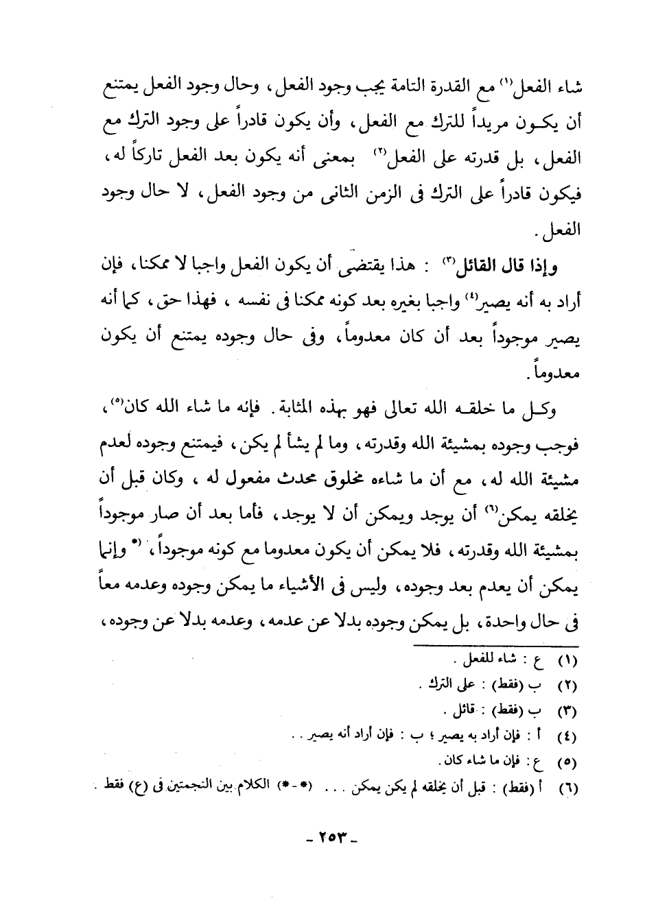 وَكُلُّ مَا خَلَقَهُ اللَّهُ تَعَالَى فَهُوَ بِهَذِهِ الْمَثَابَةِ فَإِنَّهُ مَا شَاءَ كَانَ (¬5) ، فَوَجَبَ وُجُودُهُ بِمَشِيئَةِ اللَّهِ وَقُدْرَتِهِ، وَمَا لَمْ يَشَأْ لَمْ يَكُنْ فَيَمْتَنِعُ وُجُودُهُ لِعَدَمِ مَشِيئَةِ اللَّهِ لَهُ، مَعَ أَنَّ مَا شَاءَهُ مَخْلُوقٌ مُحْدَثٌ مَفْعُولٌ لَهُ، وَكَانَ قَبْلَ أَنْ يَخْلُقَهُ يُمْكِنُ (¬6) أَنْ يُوجَدَ وَيُمْكِنُ أَنْ لَا يُوجَدَ، فَأَمَّا بَعْدَ أَنْ صَارَ مَوْجُودًا بِمَشِيئَةِ اللَّهِ وَقُدْرَتِهِ فَلَا يُمْكِنُ أَنْ يَكُونَ مَعْدُومًا مَعَ كَوْنِهِ مَوْجُودًا، (* وَإِنَّمَا يُمْكِنُ أَنْ يُعْدَمَ بَعْدَ وُجُودِهِ، وَلَيْسَ فِي الْأَشْيَاءِ مَا يُمْكِنُ وُجُودُهُ وَعَدَمُهُ مَعًا فِي حَالٍ وَاحِدَةٍ، بَلْ يُمْكِنُ وُجُودُهُ بَدَلًا عَنْ عَدَمِهِ وَعَدَمُهُ بَدَلٌ عَنْ وُجُودِهِ