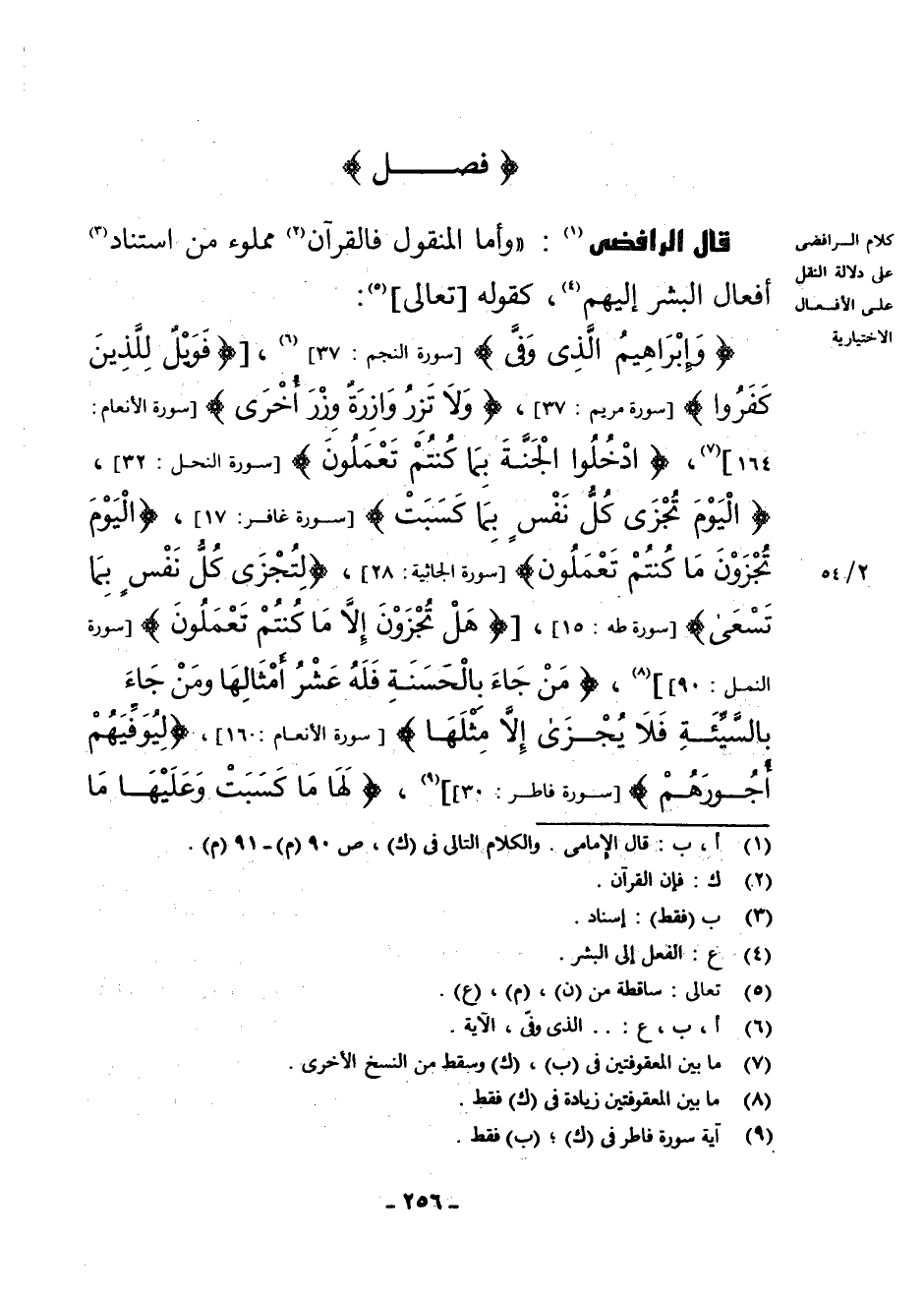 {وَإِبْرَاهِيمَ الَّذِي وَفَّى} [سُورَةُ النَّجْمِ 37] (¬6) [ {فَوَيْلٌ لِلَّذِينَ كَفَرُوا} [سُورَةُ مَرْيَمَ 37] {وَلَا تَزِرُ وَازِرَةٌ وِزْرَ أُخْرَى} [سُورَةُ الْأَنْعَامِ 164] (¬7) {ادْخُلُوا الْجَنَّةَ بِمَا كُنْتُمْ تَعْمَلُونَ} [سُورَةُ النَّحْلِ 32] {الْيَوْمَ تُجْزَى كُلُّ نَفْسٍ بِمَا كَسَبَتْ} [سُورَةُ غَافِرٍ 17] {الْيَوْمَ تُجْزَوْنَ مَا كُنْتُمْ تَعْمَلُونَ} [سُورَةُ الْجَاثِيَةِ 28] {لِتُجْزَى كُلُّ نَفْسٍ بِمَا تَسْعَى} [سُورَةُ طه 15] {هَلْ تُجْزَوْنَ إِلَّا مَا كُنْتُمْ تَعْمَلُونَ} [سُورَةُ النَّمْلِ 90]] (¬8) {مَنْ جَاءَ بِالْحَسَنَةِ فَلَهُ عَشْرُ أَمْثَالِهَا وَمَنْ جَاءَ بِالسَّيِّئَةِ فَلَا يُجْزَى إِلَّا مِثْلَهَا} [سُورَةُ الْأَنْعَامِ 160] {لِيُوَفِّيَهُمْ أُجُورَهُمْ} [سُورَةُ فَاطِرٍ: 30] (¬9) {لَهَا مَا كَسَبَتْ وَعَلَيْهَا مَا اكْتَسَبَتْ}