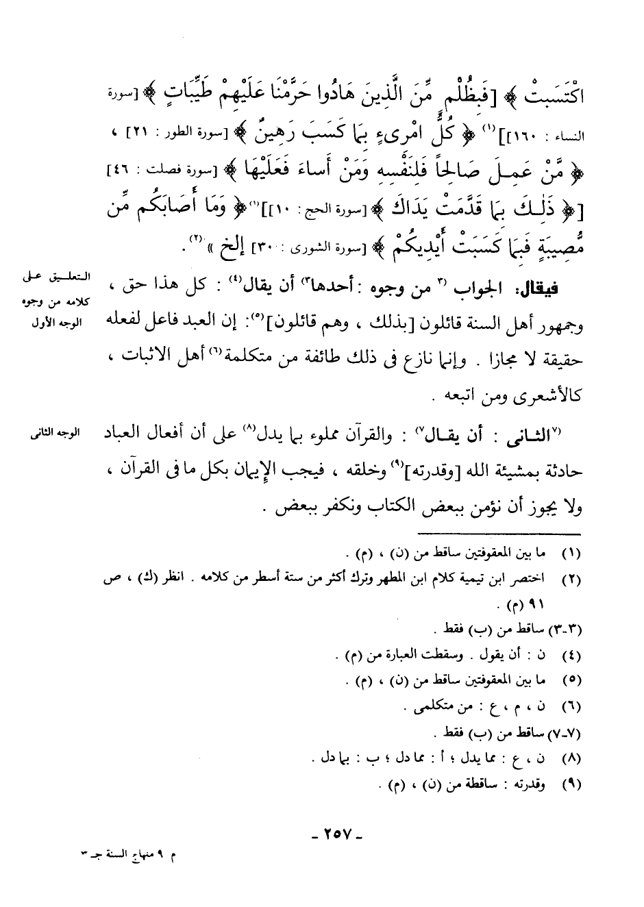 (¬2) اخْتَصَرَ ابْنُ تَيْمِيَّةَ كَلَامَ ابْنِ الْمُطَهَّرِ وَتَرَكَ أَكْثَرَ مِنْ سِتَّةِ أَسْطُرٍ مِنْ كَلَامِهِ انْظُرْ (ك) ، ص 91 (م) .