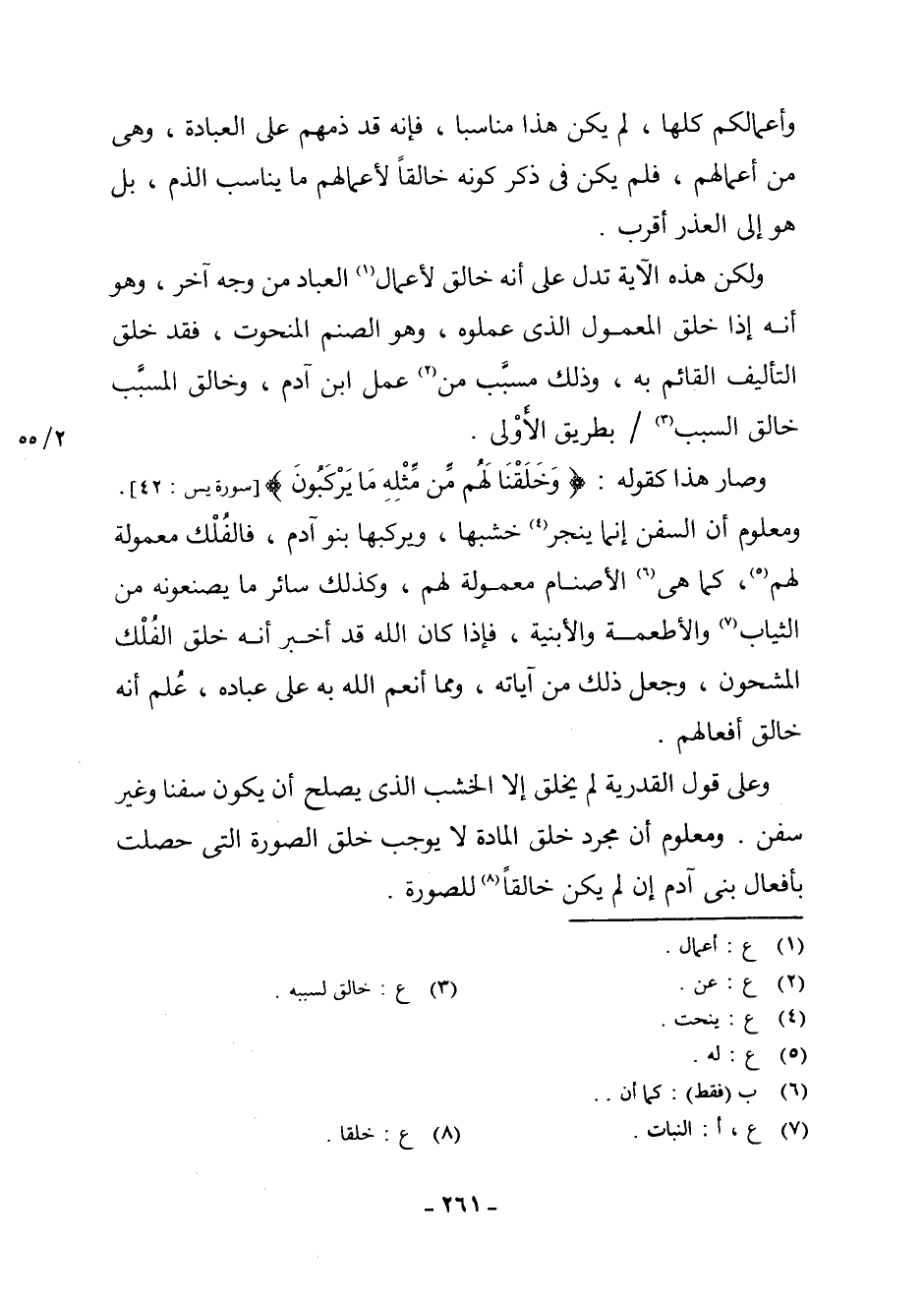 وَعَلَى قَوْلِ الْقَدَرِيَّةِ لَمْ يَخْلُقْ إِلَّا الْخَشَبَ الَّذِي يَصْلُحُ أَنْ يَكُونَ سُفُنًا وَغَيْرَ سُفُنٍ، وَمَعْلُومٌ أَنَّ مُجَرَّدَ خَلْقِ الْمَادَّةِ لَا يُوجِبُ خَلْقَ الصُّورَةِ الَّتِي حَصَلَتْ بِأَفْعَالِ بَنِي آدَمَ إِنْ لَمْ يَكُنْ خَالِقًا (¬8) لِلصُّورَةِ.