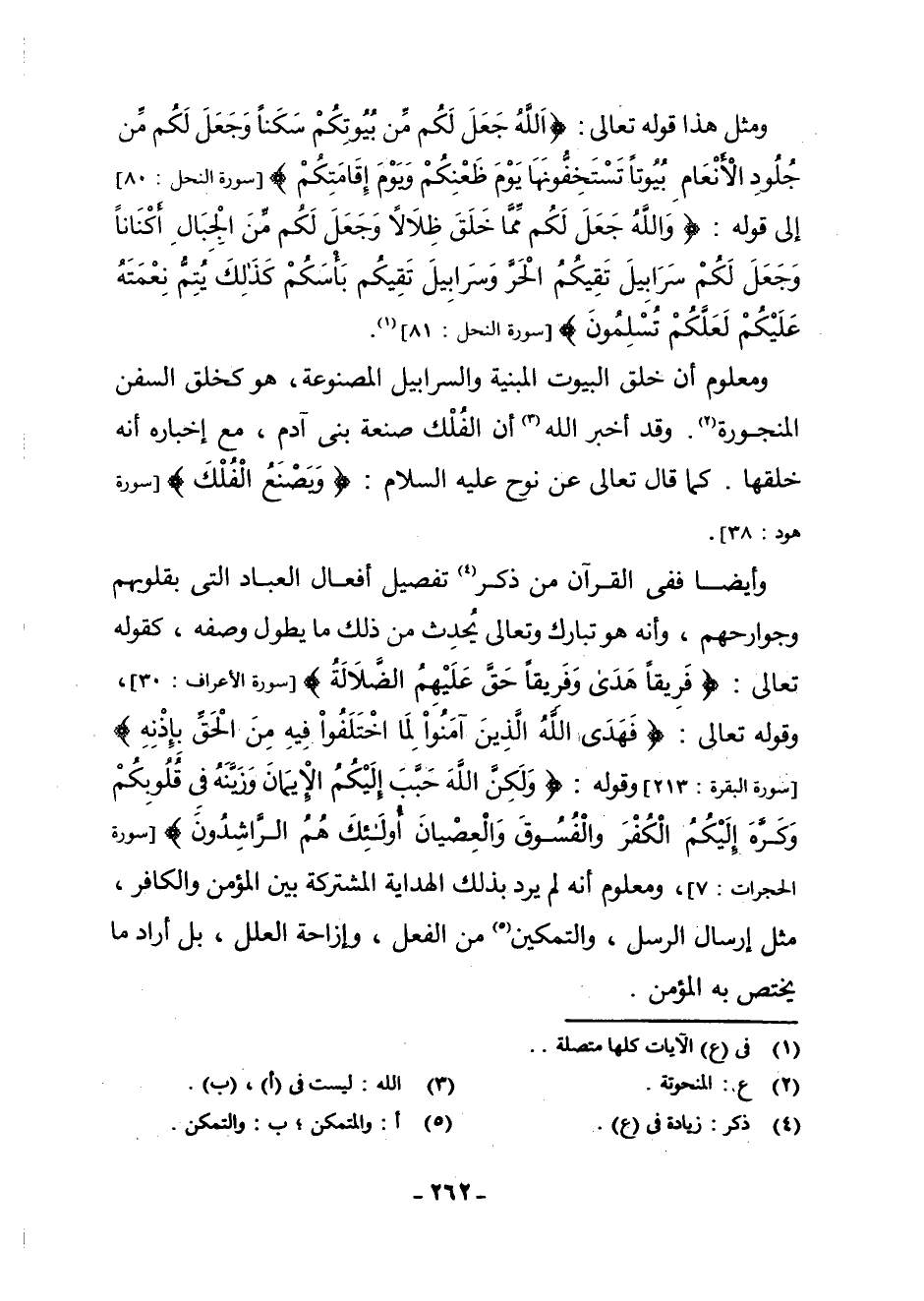وَأَيْضًا فَفِي الْقُرْآنِ مِنْ ذِكْرِ (¬4) وَأَنَّهُ هُوَ تَبَارَكَ وَتَعَالَى يُحْدِثُ مِنْ ذَلِكَ مَا يَطُولُ وَصْفُهُ كَقَوْلِهِ تَعَالَى: {فَرِيقًا هَدَى وَفَرِيقًا حَقَّ عَلَيْهِمُ الضَّلَالَةُ} [سُورَةُ الْأَعْرَافِ: 30] ، وَقَوْلِهِ تَعَالَى: {فَهَدَى اللَّهُ الَّذِينَ آمَنُوا لِمَا اخْتَلَفُوا فِيهِ مِنَ الْحَقِّ بِإِذْنِهِ} [سُورَةُ الْبَقَرَةِ: 213] ، وَقَوْلِهِ: {وَلَكِنَّ اللَّهَ حَبَّبَ إِلَيْكُمُ الْإِيمَانَ وَزَيَّنَهُ فِي قُلُوبِكُمْ وَكَرَّهَ إِلَيْكُمُ الْكُفْرَ وَالْفُسُوقَ وَالْعِصْيَانَ أُولَئِكَ هُمُ الرَّاشِدُونَ} [سُورَةُ الْحُجُرَاتِ: 7] وَمَعْلُومٌ أَنَّهُ لَمْ يُرِدْ بِذَلِكَ الْهِدَايَةَ الْمُشْتَرَكَةَ بَيْنَ الْمُؤْمِنِ وَالْكَافِرِ، مِثْلَ إِرْسَالِ الرُّسُلِ وَالتَّمْكِينِ (¬5) مِنَ الْفِعْلِ وَإِزَاحَةِ الْعِلَلِ، بَلْ أَرَادَ مَا يَخْتَصُّ بِهِ الْمُؤْمِنُ.