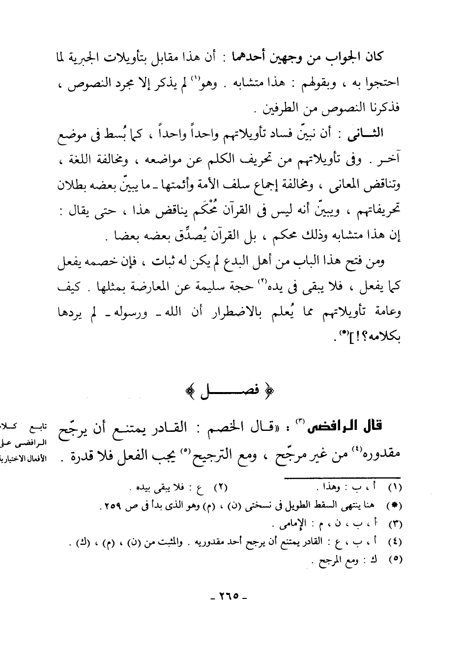 قَالَ الرَّافِضِيُّ (¬4) : قَالَ الْخَصْمُ: الْقَادِرُ يَمْتَنِعُ أَنْ يُرَجِّحَ مَقْدُورَهُ (¬5) مِنْ غَيْرِ مُرَجِّحٍ، وَمَعَ التَّرْجِيحِ (¬6) يَجِبُ الْفِعْلُ فَلَا قُدْرَةَ