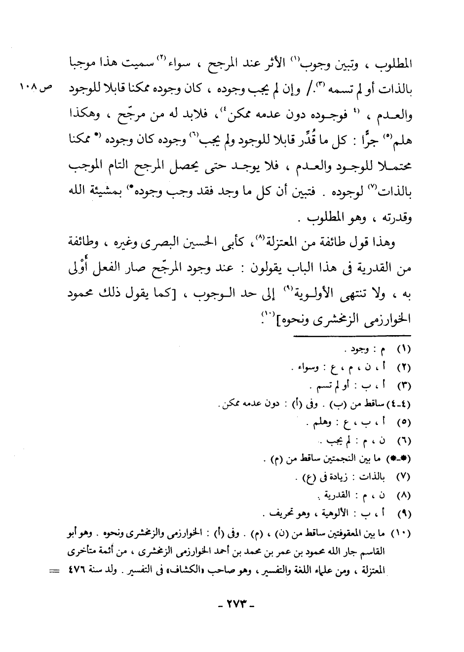 (¬11) مَا بَيْنَ الْمَعْقُوفَتَيْنِ سَاقِطٌ مِنْ (ن) ، (م) ، وَفِي (أ) : الْخُوَارَزْمِيُّ وَالزَّمَخْشَرِيُّ وَنَحْوُهُ. وَهُوَ أَبُو الْقَاسِمِ جَارُ اللَّهِ مَحْمُودُ بْنُ عُمَرَ بْنِ مُحَمَّدِ بْنِ أَحْمَدَ الْخُوَارَزْمِيُّ الزَّمَخْشَرِيُّ، مِنْ أَئِمَّةِ مُتَأَخِّرِي الْمُعْتَزِلَةِ، وَمِنْ عُلَمَاءِ اللُّغَةِ وَالتَّفْسِيرِ، وَهُوَ صَاحِبُ الْكَشَّافِ فِي التَّفْسِيرِ، وُلِدَ سَنَةَ 476 وَتُوُفِّيَ سَنَةَ 538. انْظُرْ تَرْجَمَتَهُ فِي: وَفِيَّاتِ الْأَعْيَانِ 4 - 254، 260، لِسَانِ الْمِيزَانِ 6/4 شَذَرَاتِ الذَّهَبِ 4 - 118، 121، الْعِبَرِ 4 - 106، الْأَعْلَامِ 8 - 55