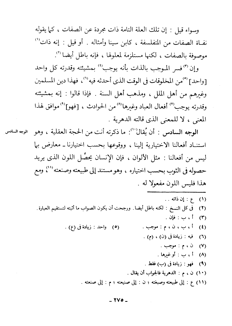 الْوَجْهُ السَّادِسُ أَنْ يُقَالَ: (¬10) مَا ذَكَرْتَهُ أَنْتَ مِنَ الْحُجَّةِ الْعَقْلِيَّةِ وَهُوَ اسْتِنَادُ أَفْعَالِنَا الِاخْتِيَارِيَّةِ إِلَيْنَا، وَوُقُوعُهَا بِحَسَبِ اخْتِيَارِنَا - مَعَارَضٌ بِمَا لَيْسَ مِنْ أَفْعَالِنَا مِثْلَ الْأَلْوَانِ، فَإِنَّ الْإِنْسَانَ يُحَصِّلُ اللَّوْنَ الَّذِي يُرِيدُ حُصُولَهُ فِي الثَّوْبِ بِحَسَبِ اخْتِيَارِهِ، وَهُوَ مُسْتَنِدٌ إِلَى طَبِيعَتِهِ وَصَنْعَتِهِ، (¬11) وَمَعَ هَذَا فَلَيْسَ اللَّوْنُ مَفْعُولًا لَهُ.