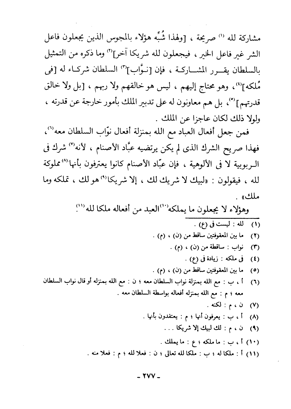 مُشَارَكَةٌ لِلَّهِ (¬1) صَرِيحَةٌ [وَلِهَذَا شُبِّهَ هَؤُلَاءِ بِالْمَجُوسِ الَّذِينَ يَجْعَلُونَ فَاعِلَ الشَّرِّ غَيْرَ فَاعِلِ الْخَيْرِ، فَيَجْعَلُونَ لِلَّهِ شَرِيكًا آخَرَ] (¬2) وَمَا ذَكَرَهُ مِنَ التَّمْثِيلِ بِالسُّلْطَانِ يُقَرِّرُ الْمُشَارَكَةَ، فَإِنَّ [نُوَّابَ] (¬3) السُّلْطَانِ شُرَكَاءُ لَهُ [فِي مُلْكِهِ] (¬4) ، وَهُوَ مُحْتَاجٌ إِلَيْهِمْ، لَيْسَ هُوَ خَالِقَهُمْ وَلَا رَبَّهُمْ، [بَلْ وَلَا خَالِقَ قُدْرَتِهِمْ] (¬5) بَلْ هُمْ مُعَاوِنُونَ لَهُ عَلَى تَدْبِيرِ الْمُلْكِ بِأُمُورٍ خَارِجَةٍ عَنْ قُدْرَتِهِ، وَلَوْلَا ذَلِكَ لَكَانَ عَاجِزًا عَنِ الْمُلْكِ.