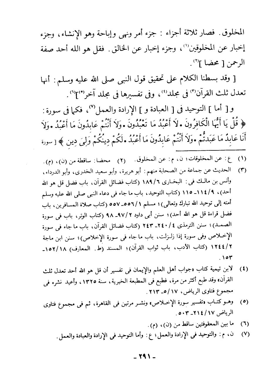 (¬4) لِابْنِ تَيْمِيَّةَ كِتَابُ جَوَابِ أَهْلِ الْعِلْمِ وَالْإِيمَانِ فِي تَفْسِيرِ أَنَّ قُلْ هُوَ اللَّهُ أَحَدٌ تَعْدِلُ ثُلُثَ الْقُرْآنِ، وَقَدْ طُبِعَ أَكْثَرَ مِنْ مَرَّةٍ؛ فَطُبِعَ فِي الْمَطْبَعَةِ الْخَيْرِيَّةِ، سَنَةَ 1325، وَأُعِيدَ نَشْرُهُ فِي مَجْمُوعِ فَتَاوَى الرِّيَاضِ 17 - 5، 213.
