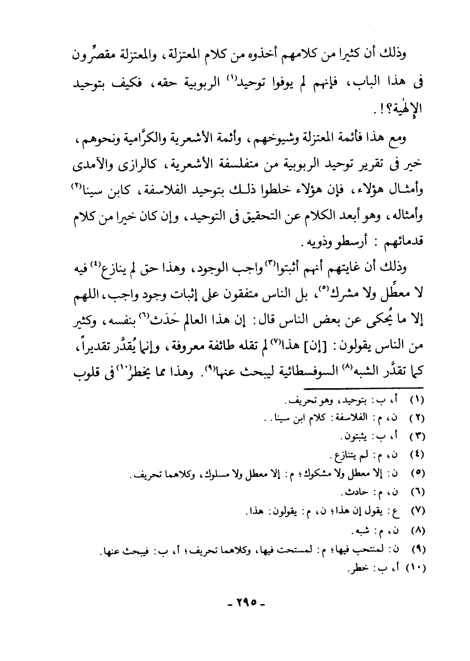 وَمَعَ هَذَا فَأَئِمَّةُ الْمُعْتَزِلَةِ وَشُيُوخُهُمْ وَأَئِمَّةُ الْأَشْعَرِيَّةِ وَالْكَرَّامِيَّةِ وَنَحْوُهُمْ خَيْرٌ فِي تَقْرِيرِ تَوْحِيدِ الرُّبُوبِيَّةِ مِنْ مُتَفَلْسِفَةِ الْأَشْعَرِيَّةِ كَالرَّازِيِّ وَالْآمِدِيِّ وَأَمْثَالِ هَؤُلَاءِ، فَإِنَّ هَؤُلَاءِ خَلَطُوا ذَلِكَ بِتَوْحِيدِ الْفَلَاسِفَةِ كَابْنِ سِينَا (¬2) وَأَمْثَالِهِ، وَهُوَ أَبْعَدُ الْكَلَامِ عَنِ التَّحْقِيقِ فِي التَّوْحِيدِ، وَإِنْ كَانَ خَيْرًا مِنْ كَلَامِ قُدَمَائِهِمْ أَرِسْطُو وَذَوِيهِ.