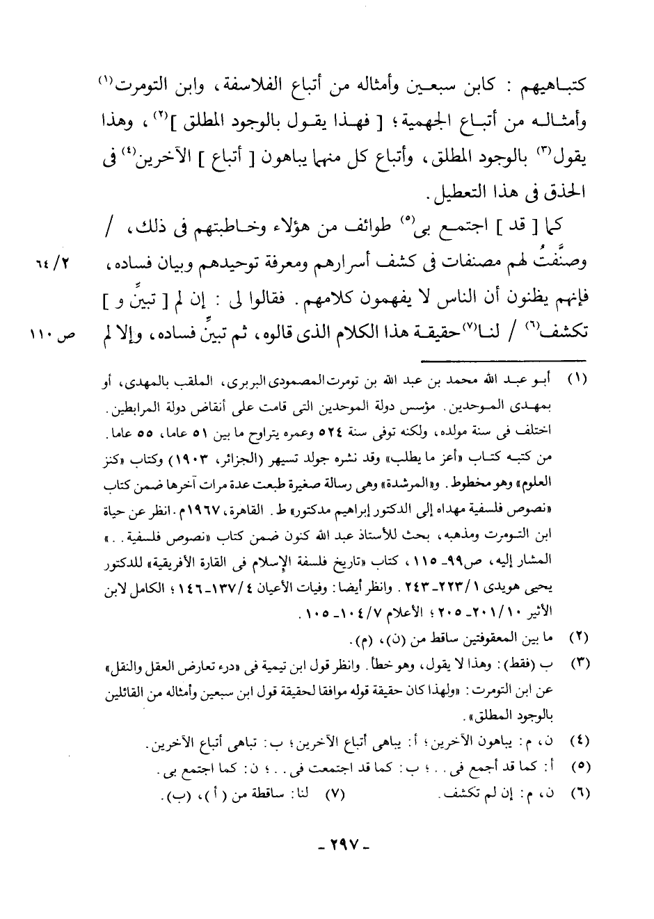 (¬3) ب فَقَطْ: وَهَذَا لَا يَقُولُ، وَهُوَ خَطَأٌ، وَانْظُرْ قَوْلَ ابْنِ تَيْمِيَّةَ فِي " دَرْءِ تَعَارُضِ الْعَقْلِ وَالنَّقْلِ "، عَنِ ابْنِ التُّومَرْتِ: " وَلِهَذَا كَانَ حَقِيقَةُ قَوْلِهِ مُوَافِقًا لِحَقِيقَةِ قَوْلِ ابْنِ سَبْعِينَ وَأَمْثَالِهِ مِنَ الْقَائِلِينَ بِالْوُجُودِ الْمُطْلَقِ ".