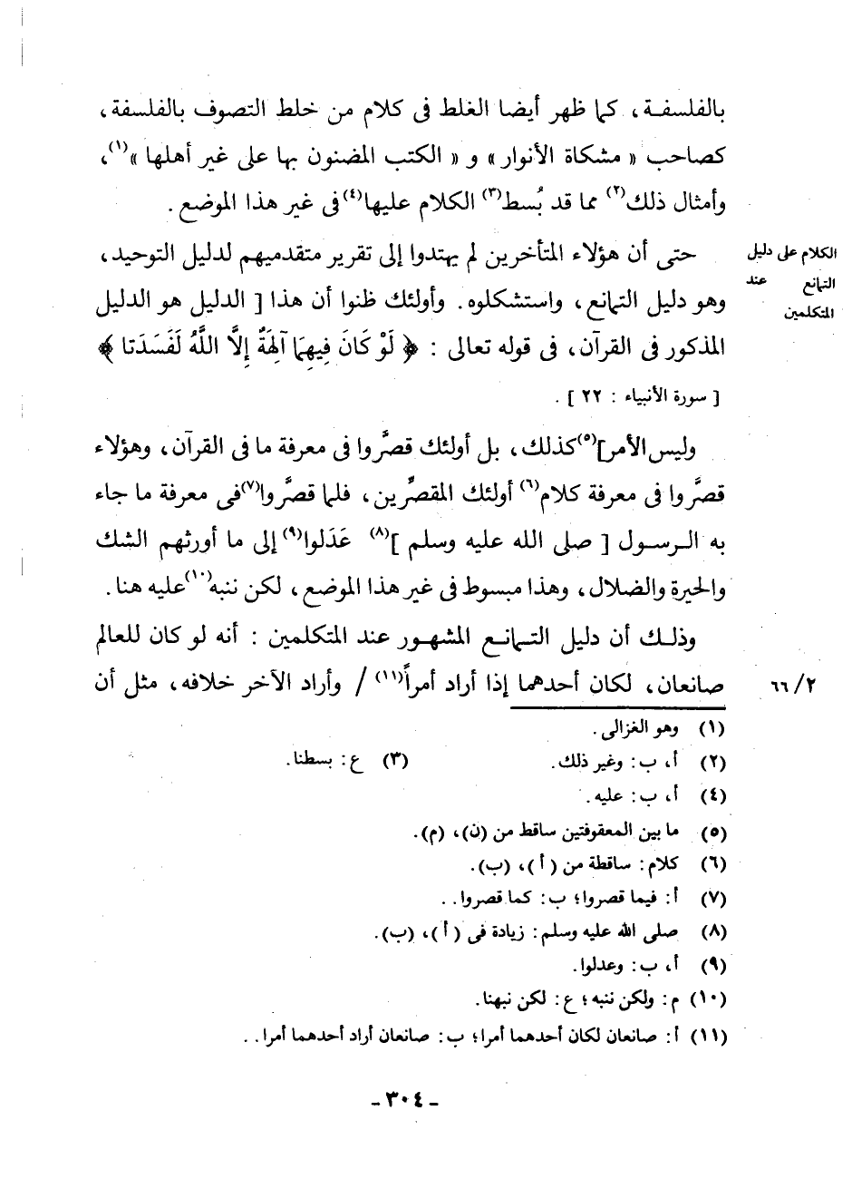 وَذَلِكَ أَنَّ دَلِيلَ التَّمَانُعِ الْمَشْهُورَ عِنْدَ الْمُتَكَلِّمِينَ: أَنَّهُ لَوْ كَانَ لِلْعَالَمِ صَانِعَانِ لَكَانَ أَحَدُهُمَا إِذَا أَرَادَ أَمْرًا (¬11) وَأَرَادَ الْآخَرُ خِلَافَهُ، مِثْلَ أَنْ