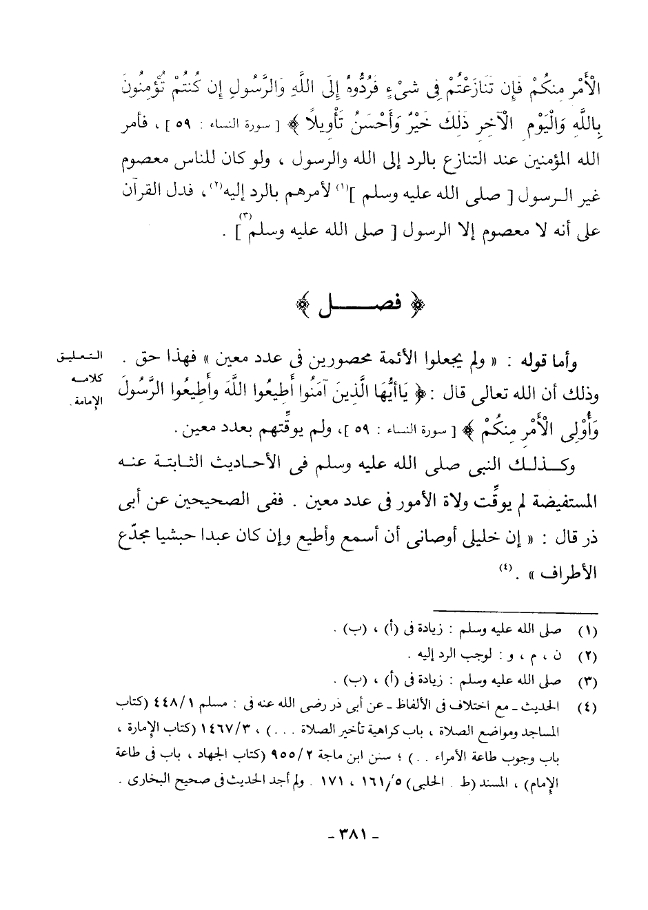 [فصل التعليق على كلامه عن الإمامة " وَلَمْ يَجْعَلُوا الْأَئِمَّةَ مَحْصُورِينَ فِي عَدَدٍ مُعَيَّنٍ "]