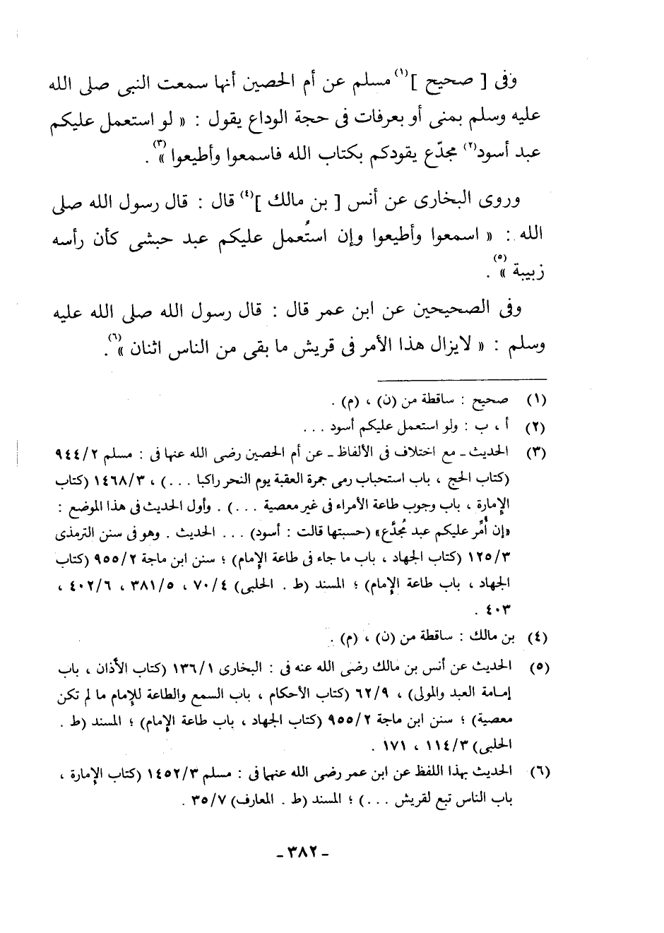 (¬5) الْحَدِيثُ عَنْ أَنَسِ بْنِ مَالِكٍ - رَضِيَ اللَّهُ عَنْهُ - فِي: الْبُخَارِيِّ 1 - 136 كِتَابُ الْأَذَانِ، بَابُ إِمَامَةِ الْعَبْدِ وَالْمَوْلَى، 9 - 62 كِتَابُ الْأَحْكَامِ، بَابُ السَّمْعِ وَالطَّاعَةِ لِلْإِمَامِ مَا لَمْ تَكُنْ مَعْصِيَةٌ، سُنَنِ ابْنِ مَاجَهْ، 2 - 955 كِتَابُ الْجِهَادِ بَابُ طَاعَةِ الْإِمَامِ، الْمُسْنَدِ ط الْحَلَبِيِّ 3 - 114، 171.