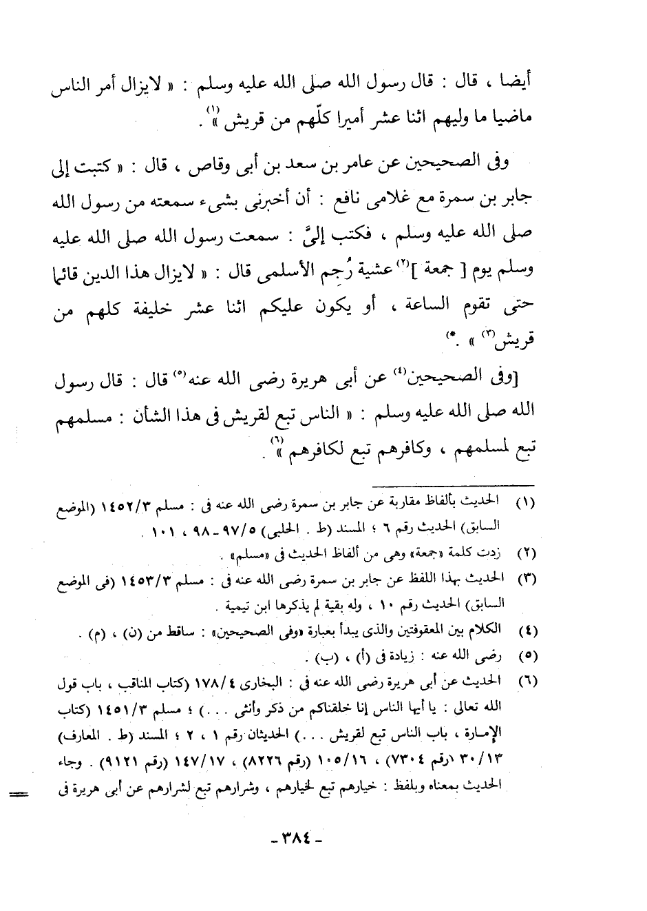 (¬7) الْحَدِيثُ عَنْ أَبِي هُرَيْرَةَ - رَضِيَ اللَّهُ عَنْهُ - فِي: الْبُخَارِيِّ 4 - 178 كِتَابُ الْمَنَاقِبِ، بَابُ قَوْلِ اللَّهِ تَعَالَى: يَا أَيُّهَا النَّاسُ إِنَّا خَلَقْنَاكُمْ مِنْ ذَكَرٍ وَأُنْثَى، مُسْلِمٍ 3 - 1451 كِتَابُ الْإِمَارَةِ، بَابُ النَّاسِ تَبَعٌ لِقُرَيْشٍ، الْحَدِيثَانِ رَقْمُ 1، 2، الْمُسْنَدِ ط الْمَعَارِفِ، 13 - 30 رَقْمُ 7304، 16. 105 رَقْمُ 8226، 17/147 رَقْمُ 9121 وَجَاءَ الْحَدِيثُ بِمَعْنَاهُ وَبِلَفْظِ: خِيَارُهُمْ تَبَعٌ لِخِيَارِهِمْ، وَشِرَارُهُمْ تَبَعٌ لِشِرَارِهِمْ عَنْ أَبِي هُرَيْرَةَ فِي الْمُسْنَدِ ط. الْمَعَارِفِ 13 - 282 رَقْمُ 7547، وَجَاءَ الْحَدِيثُ أَيْضًا بِمَعْنَاهُ وَبِأَلْفَاظٍ مُقَارِبَةٍ عَنْ عَدَدٍ مِنَ الصَّحَابَةِ رِضْوَانُ اللَّهِ عَلَيْهِمْ مِنْهُمْ: أَبُو بَكْرٍ الصِّدِّيقُ فِي: الْمُسْنَدِ ط. الْمَعَارِفِ 1 - 164، عَلِيُّ بْنُ أَبِي طَالِبٍ 2 - 126، 127 أَبُو هُرَيْرَةَ 18 - 171، ط الْحَلَبِيِّ 4/101 عَنْ مُعَاوِيَةَ.